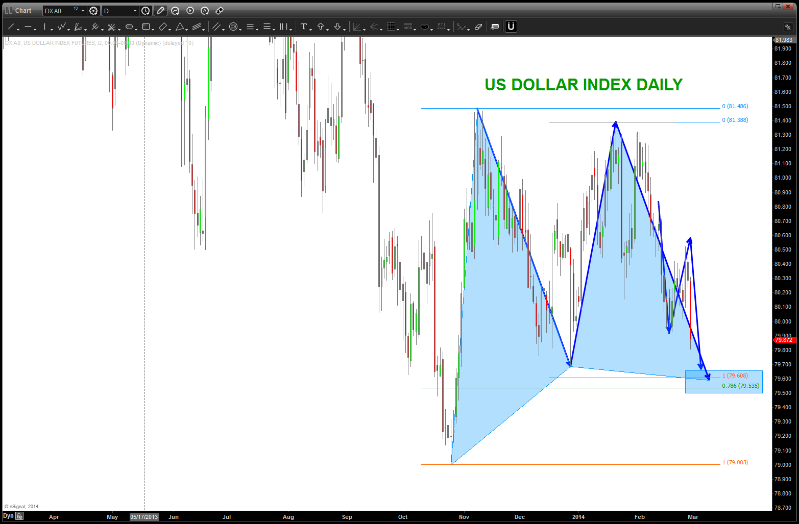 The Dollar and the Currency Market is, again, the Gorilla in the corner juggling dynamite. Per our last post (https://bartscharts.com/2014/02/19/dollar-index-positive-reversal-forming-on-daily/) we mentioned a potential positive reversal (which has been defeated) and one more target lower in/around 79.53-79.60. This is EXTREMELY important for the thesis of the Dollar moving up …