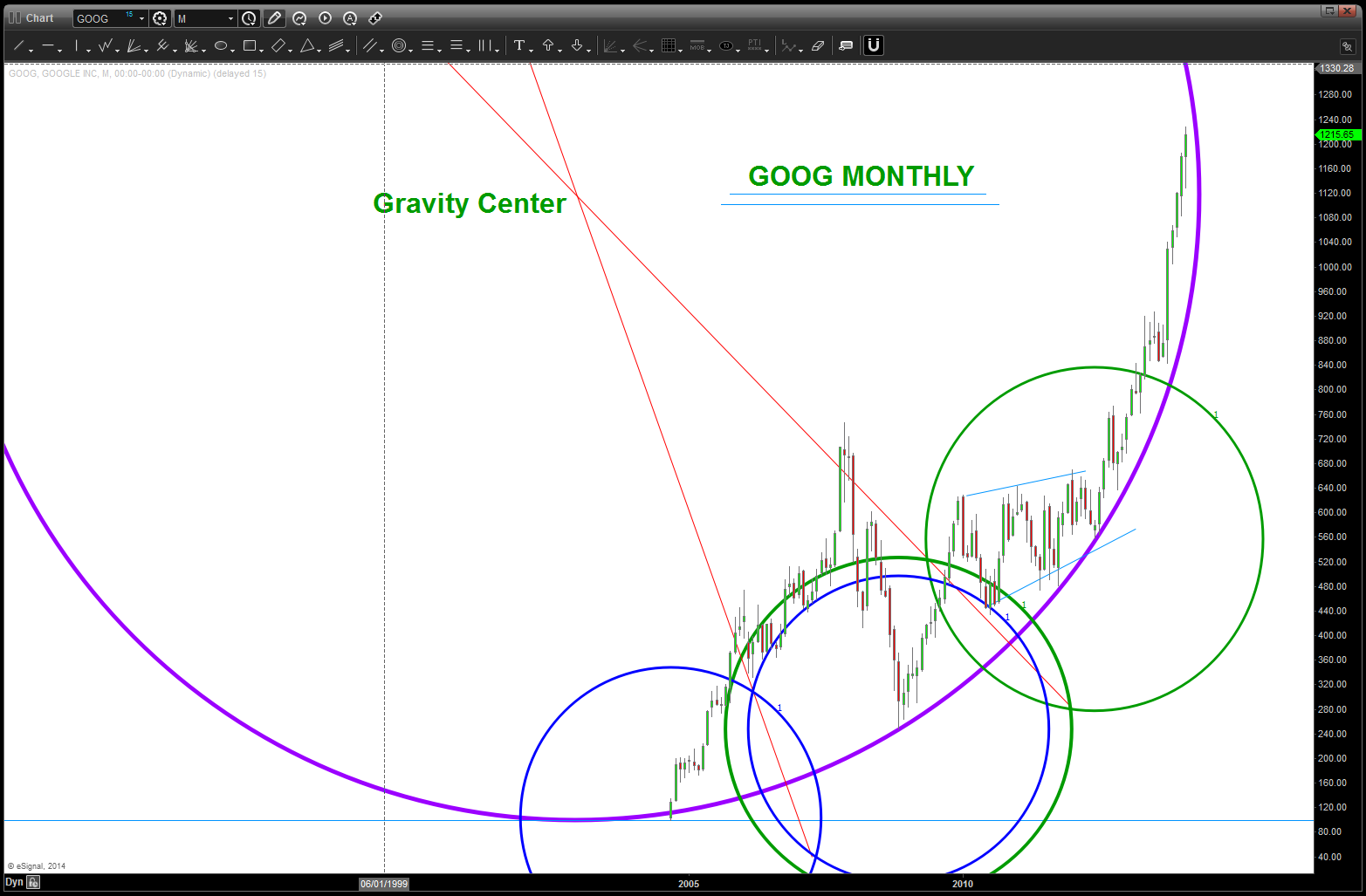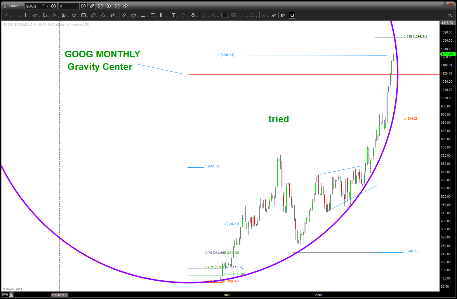 continuing to work GOOG as one, if note the most, “important” stocks to be watching w/ regards to it’s weighting, psychological effect, etc …click the link below to see previous posts. we are in another zone of targets that “probably won’t” hold it, because as luck would have it his stock is NEVER going to go down.