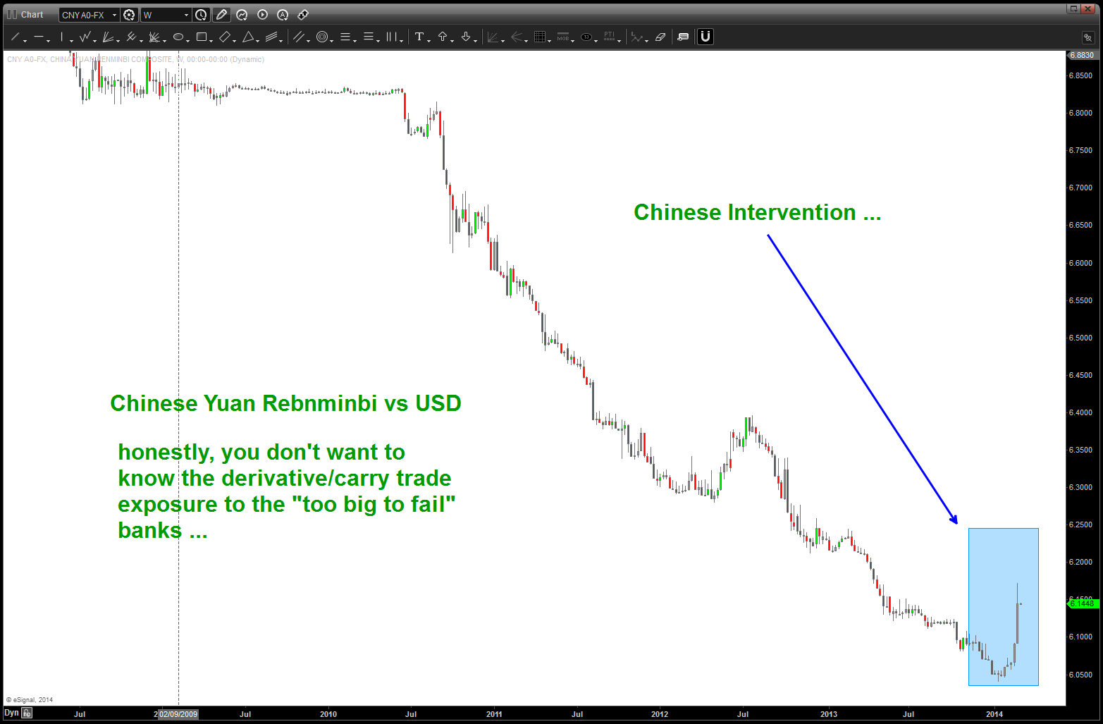 it’s Sunday night and another 10-12″ is coming our way in Leesburg, VA. The Asian markets are opening down 1-1.3% and EVERYONE is focusing on Ukraine. And, well, rightly so. That being said, believe we also need to look over at China. A financial crisis is brewing. The Chinese Yuan crashed last week due to intervention by the Chinese government. Why is this a big deal? The same reason 2007-2008 was a thumping … D E R I V A T I V E S. Leveraged carry trades have been the no brainer trade …that all got spooked last week. The potential losses to the “too big to fail” banks is in the 100’s of billions …
