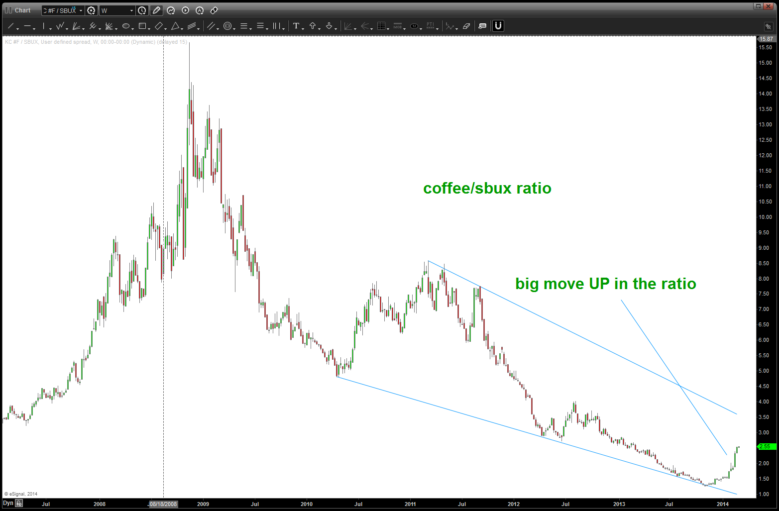 the cliff notes was that it wasn’t the price of coffee but the relative strength (COFFEE/SBUX) that had synced nicely.