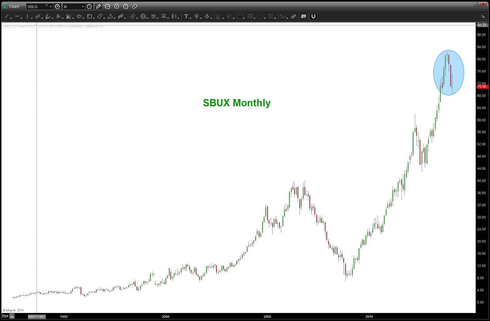 a lot of work goes into finding high probability set-ups … this was our last post on Coffee Futures and SBUX. I had been trying to find an end (not trying to call a top but simply look for a pattern) to the SBUX run. Ratio analysis was finally sealed the deal for me …
