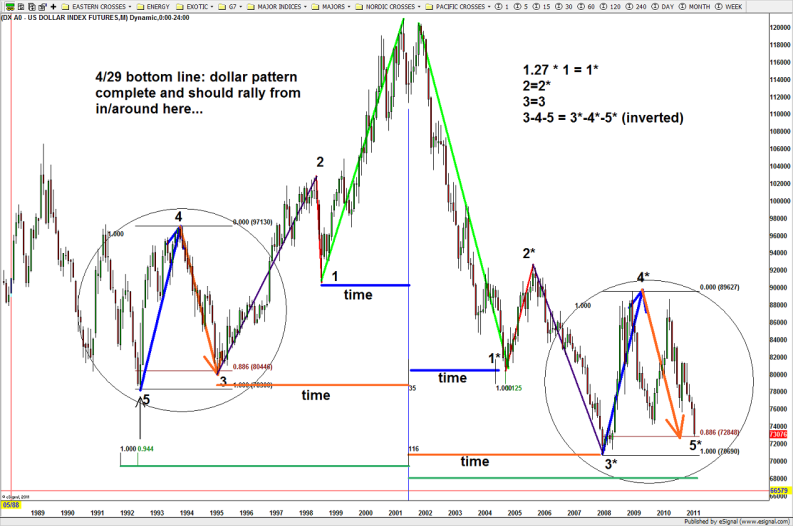 CLIFF NOTES: the BULLISH thesis is that after the 5 waves down from 121, a 3 wave (at a minimum) corrective pattern should ensue (A-B-C) and therefore the bounce has farther to travel. Additionally, it could mark a MAJOR low and we are starting back up for 5 waves. The BULLISH consensus for the US DOLLAR is that this move UP is not complete. Please see this chart below … and, notice the EXACT move up from the PATTERN shown above at the “2 or B” level.