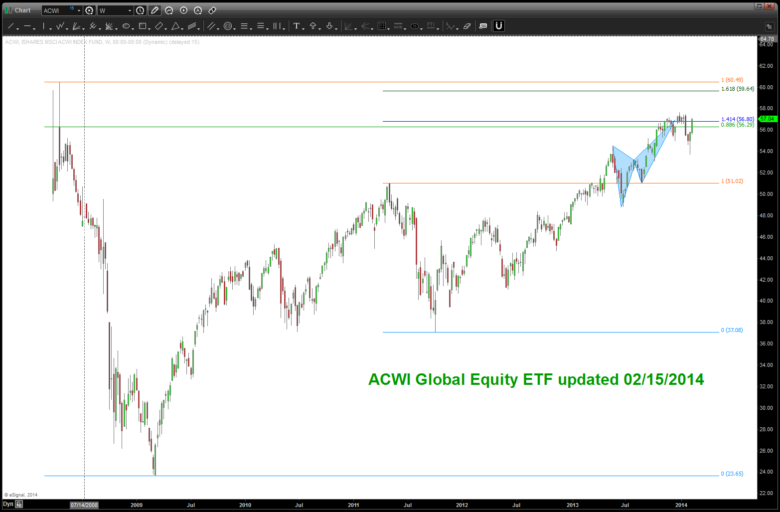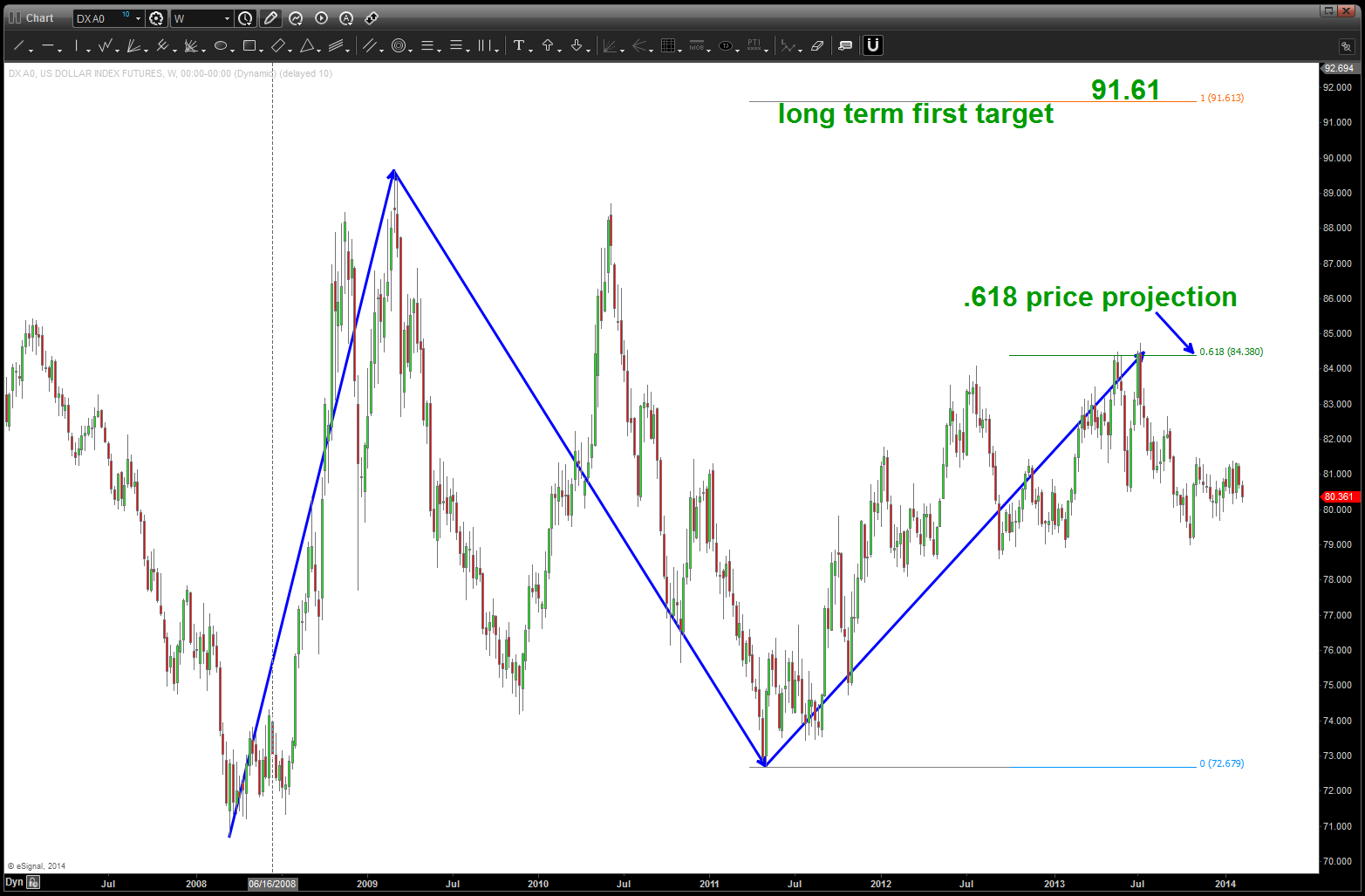so where are we now? Without showing an “elaborate” count, we can see by the chart below that we smacked right into a “big picture” .618 price projection that had it’s genesis from the 71 price low.