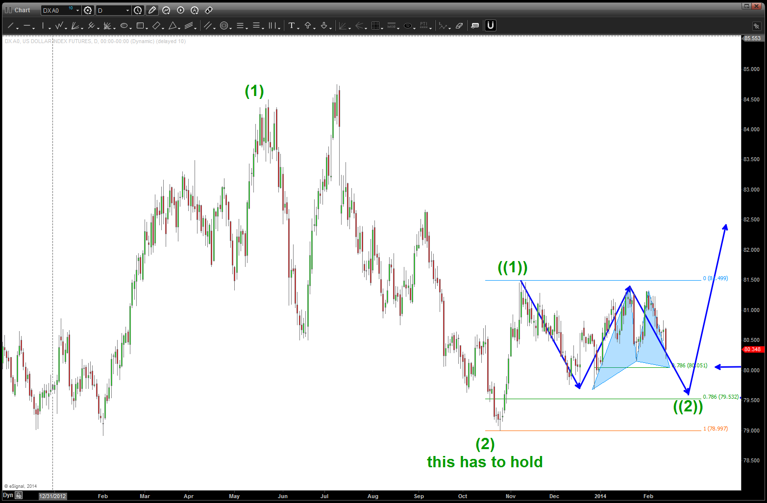 here’s the possible bullish count from the “2 or B” low that shows a POTENTIAL 3rd wave underway. IF the count is correct, then the 79 level has to hold and is very crucial as it suggest that the 3rd wave should begin …soon and UP we go.