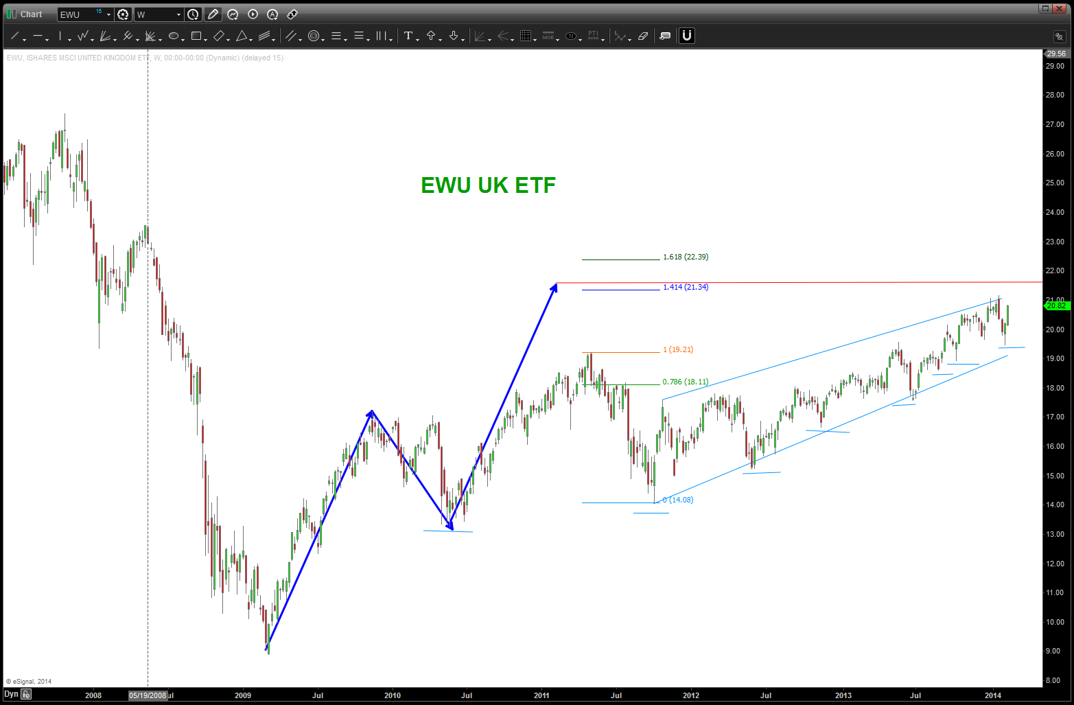 - note the UP orange arrow w/ the DOWN red arrow and how these arrows are overlaid by a blue triangle. the 5 wave sequence UP from the low at 1.4 is equal to the orange arrow UP so the PATTERN is the same so a correction down to the red arrow level would be an opportune time to BUY rates.