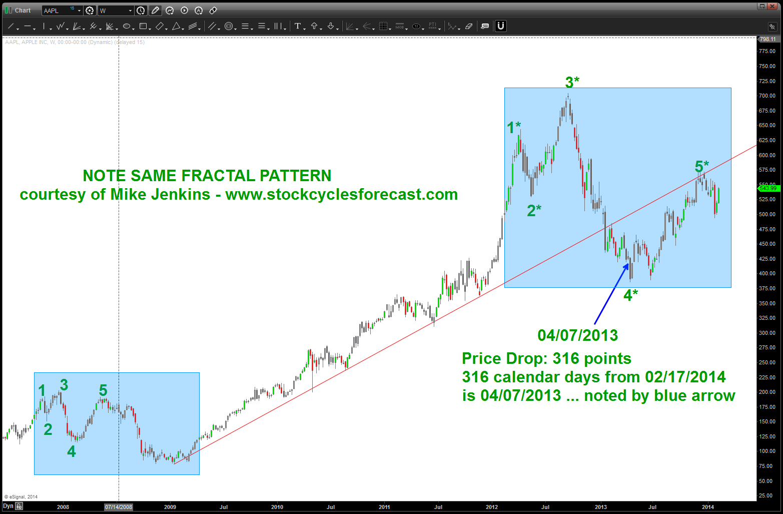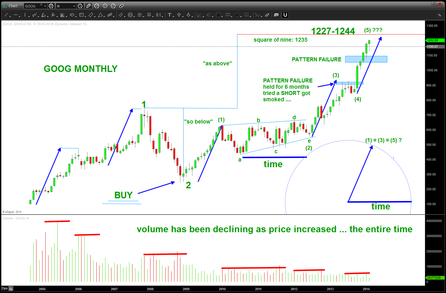 well, I guess we’ll see … if you go to the link above you’ll see the work that has been done on AAPL. And, while the AAPL work has called EVERY swing low and swing high – GOOG has kicked our butt. Patterns work and Patterns fail …but they are an edge and that’s what were looking for …