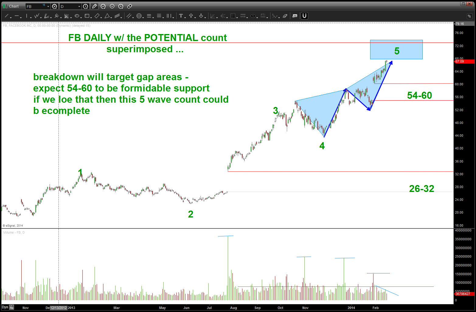 THANKS for the question … would be looking for TOPPING areas in/around now to the 72 level as it does appear we have finished a 5 waves sequence. Bullish trend to continue w/ support found in/around 54-60.