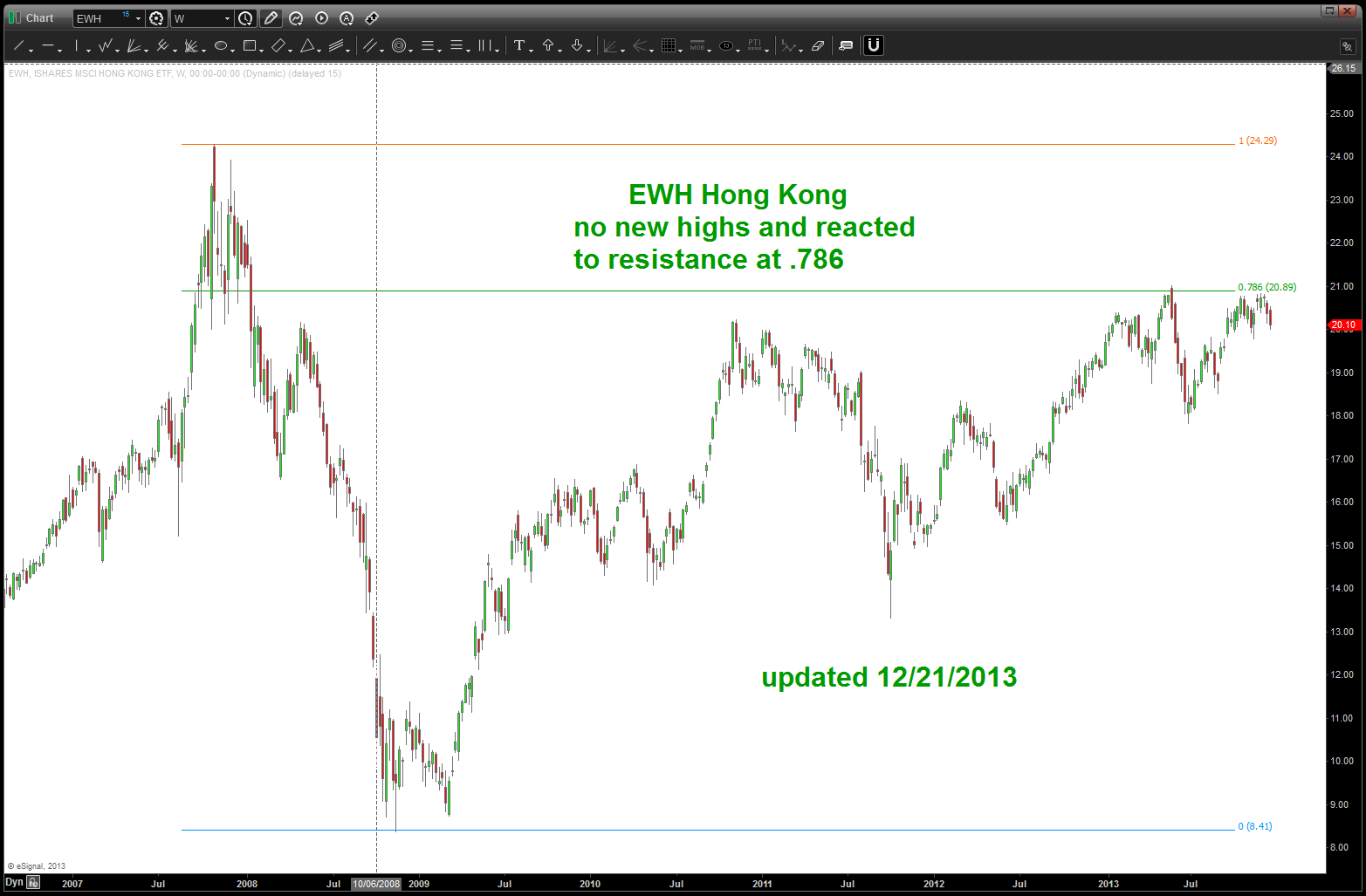 we completed a perfect price/time pattern BUY on the ratio and it did, in fact, respect the pattern level. HOWEVER, since then we have taken out the lows of that pattern and if we go back you’ll see that the .786 was ‘still a target.’ the importance of this ratio cannot be overstated – at every major inflection point since 2000 (I don’t have data that goes back any farther) it has pointed to all of the tops and bottoms of the market. perhaps we’ll go down and tag the .786 … what I can say, is if we blow thru the .786 then it will show a lack of institutional fear in this market as the thesis is the staples start to out perform as rotation occurs in a volatile or bearish market. so far, this ratio has been stagnant and correcting for a very long time … let’s stay tuned and see what a little lower does for our ratio.