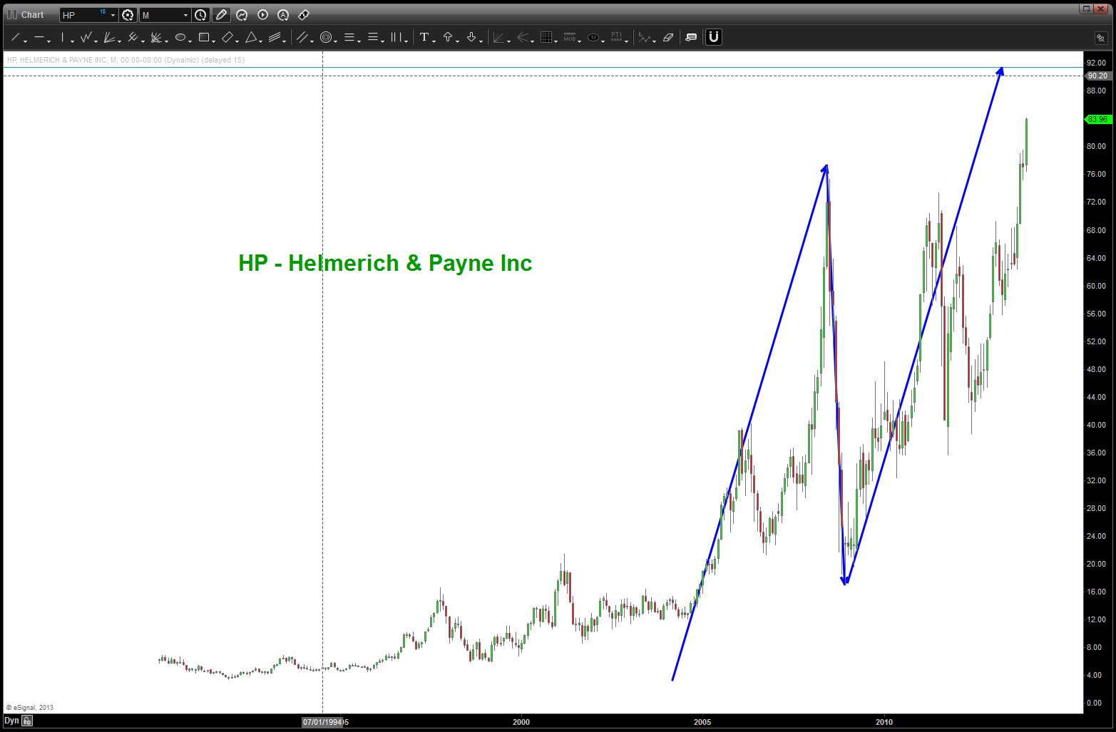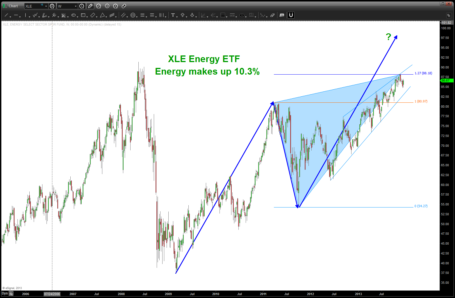 - energy 10.3%: using XLE as a proxy. see chart below. no new high, an extension sell pattern complete at 88 but perhaps 97 is where it will go.