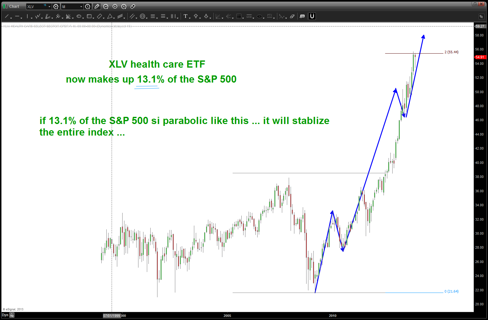 - health care 13.1%: using XLV as a proxy. see chart below. no discernible pattern however it’s approaching PARABOLIC
