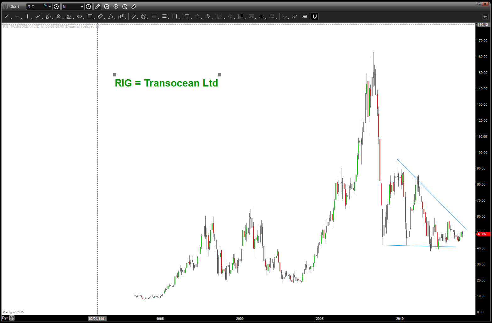 Crude Oil: https://bartscharts.com/2013/10/31/crude-oil-a-potential-roadmap/ this was my last post. I am still in the “look and feel” phase that the top at 147 was a 3 and the low in/around 35 was a 4. while the pattern completing at 110 was good, the thrust off this bottom trend line last week led me to see a triangle where we can see a,b,c,d,e – triangle complete and off to a new high ? CRUDE BULLISH