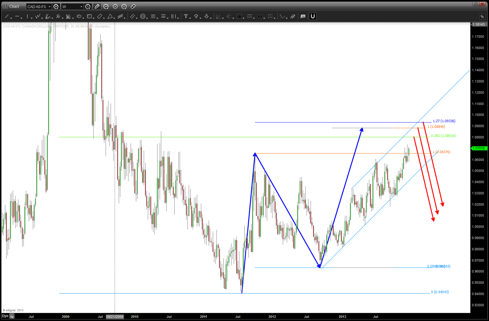 one last, this is something to be patient w/ …. I would not recommend jumping all over this tomorrow but wait and see these levels get attacked … the GREAT thing about PATTERNS is we now have clear lines in the sand for where we are correct or wrong. Go back to the beginning of the post – w/ that divergence between the OSX and CAD-Crude the patterns will tell us which way this entire family (Crude, OSX, CAD) will resolve. It very well could go completely opposite but not until the pattern levels are targeted. they will either work or fail and then we’ll pounce