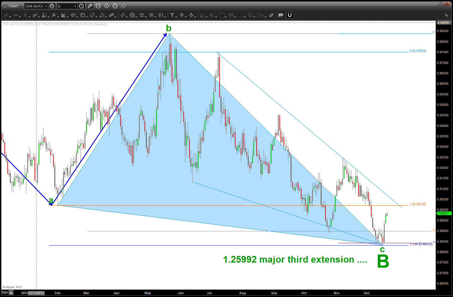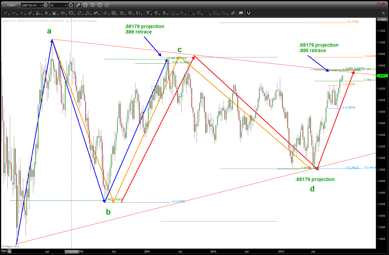 we have discussed in former posts the importance of the 1.68179 ratio and it’s relationship to the equal octave scale of music and how, at times, the .68179 price projection technique is very helpful. in a triangle, you have 5 waves – a,b,c,d,e and they are “normally” w/in the .618 relationship. well, in the case of the Pound you can see .68179 and .886 have been very strong ratio’s. so, this entire triangle thesis is about 50 pips from become a reality or getting blow out of the water. I tested a small short last month and was stopped out … since then, I have been waiting for 5 waves at a lesser degree (time frame) to support the thesis. It hasn’t happened ….so, this final level as shown in the chart above will be my line in the sand. this has been one heck of a fight …