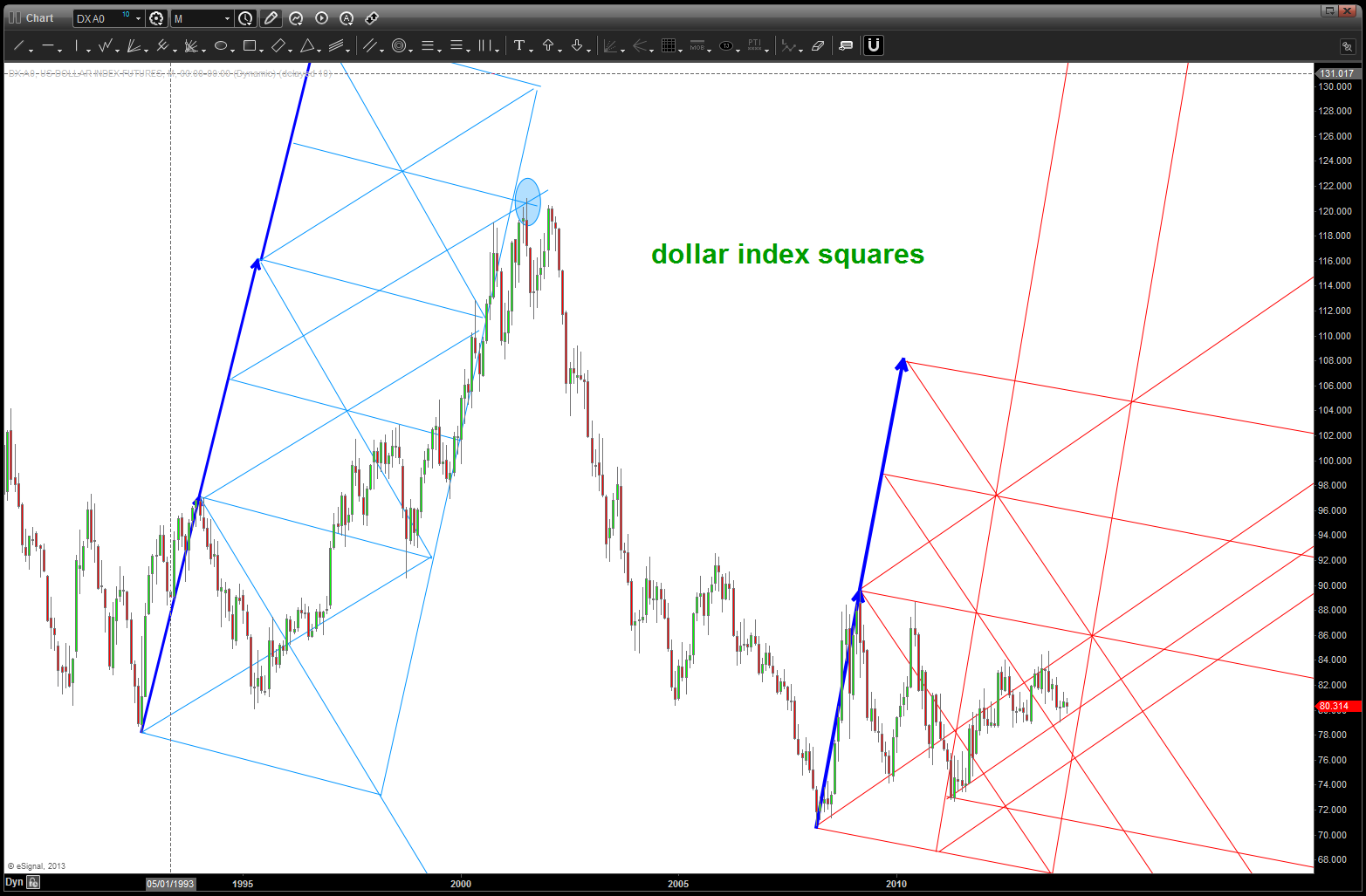 as I followed this last move down I naturally thought we would get a bounce in/around the pattern called a zig-zag/ab=cd/equality of moves/etc. In fact as you can see, it did bounce rather strongly in/around that level (to be exact) however, the wave count wasn’t complete. so, we did one more wave down and hit exactly at 1.05946*a = c. With that level being hit, we have a weekly signal reversal and, additionally, we are selling off rather nicely w/ the Euro and the Dollar Index appears to have bottomed. Also, note the TIME component. IF we have the PRICE w/ a 1.05946 component THEN we have 27 weekly bars in the ab move so 1.0594*27=29 and that give us an PRICE and TIME equality.