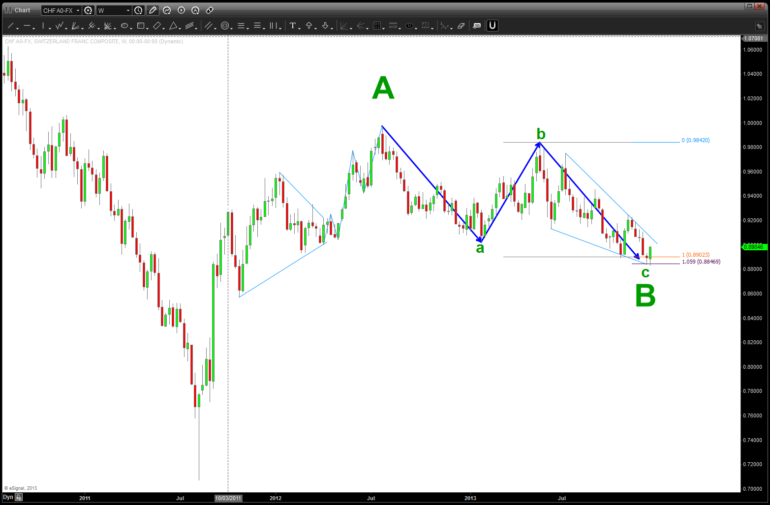 what I saw was an “ending diagonal” that was nicely showing us 5 waves down and that would have represented the end of a somewhat “flat” correction that started in July 2012. Yes, it’s been 1 year and 5 months since the high….and, think about it, it’s ONLY retraced right in/around .382.