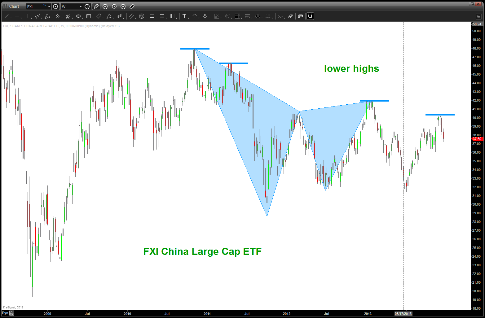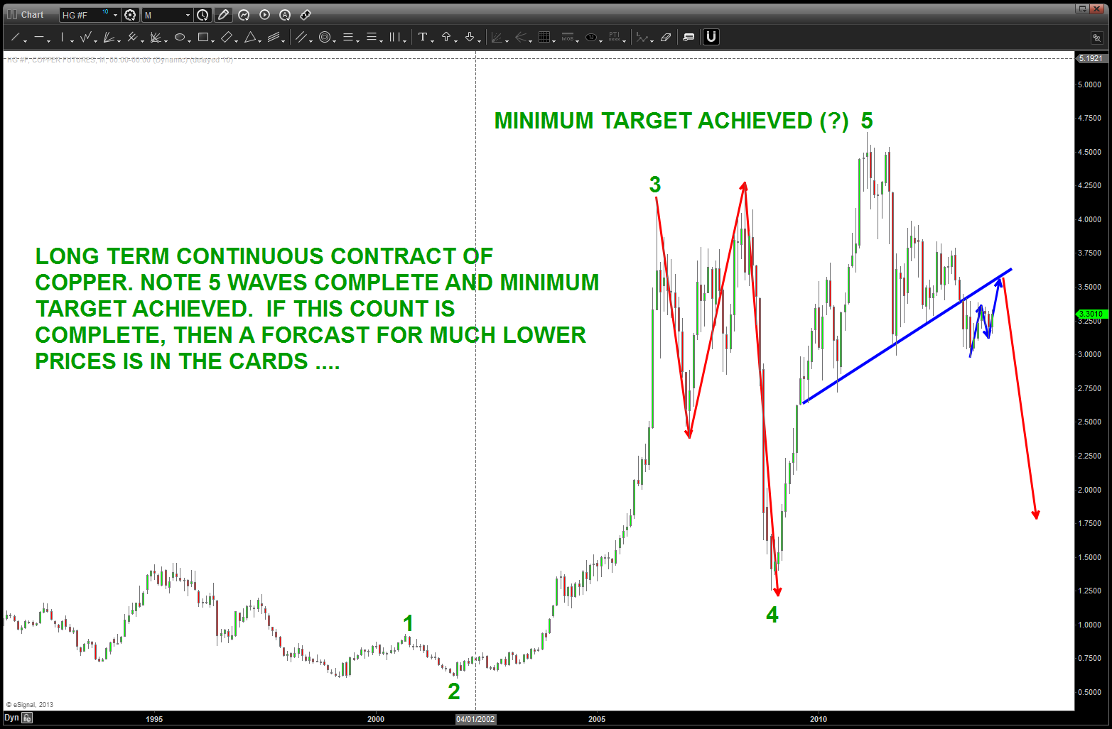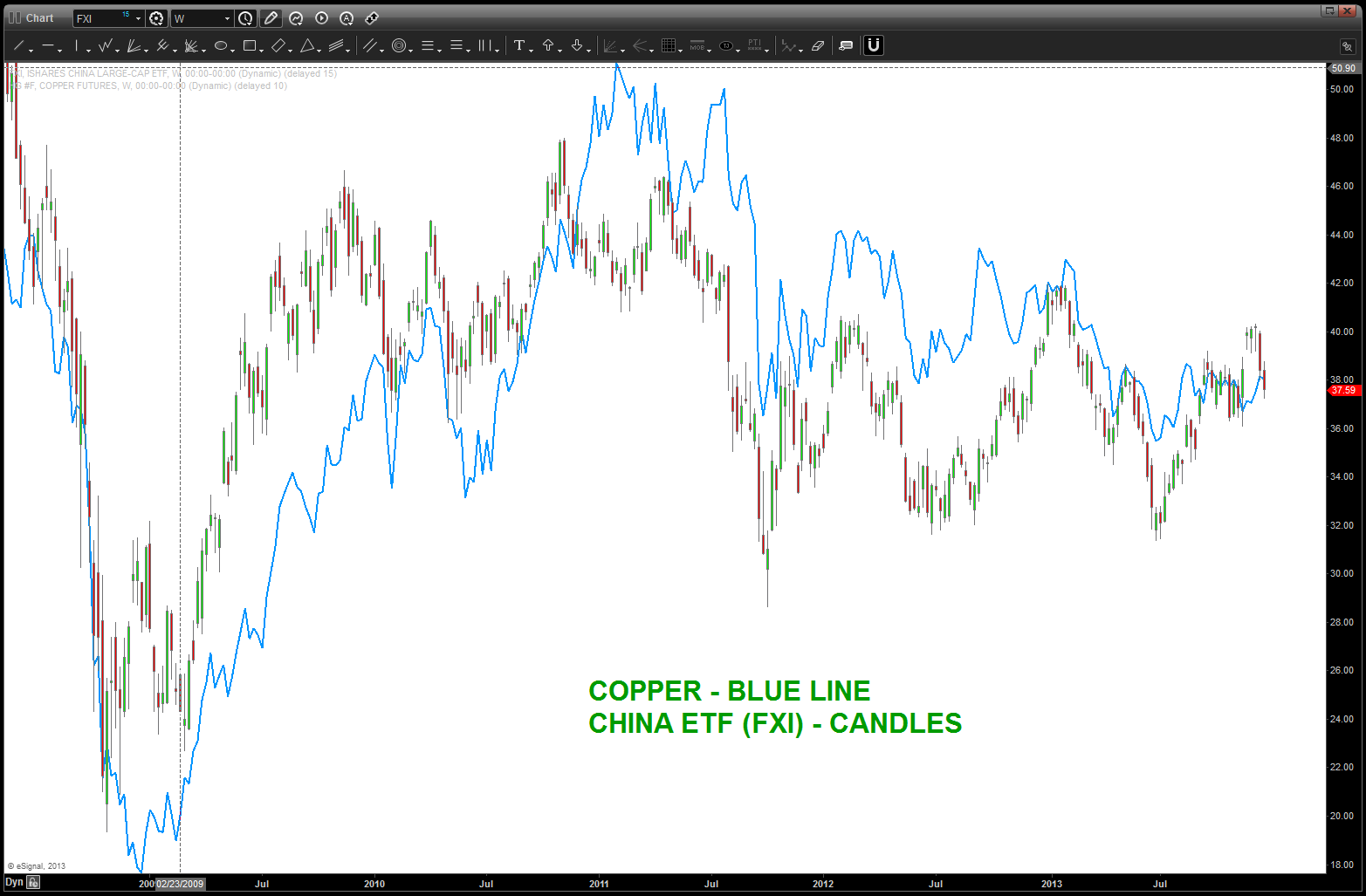 the count (long term) for copper appears to have completed a very well defined 5 wave move … if this is correct, then perhaps we have a little larger rally to kiss the neckline and then down into much lower prices. why is this important to China? well, from a chart view they are aligned extremely nicely. so, IF Copper is going to go down THEN so should FXI if the correlation holds …