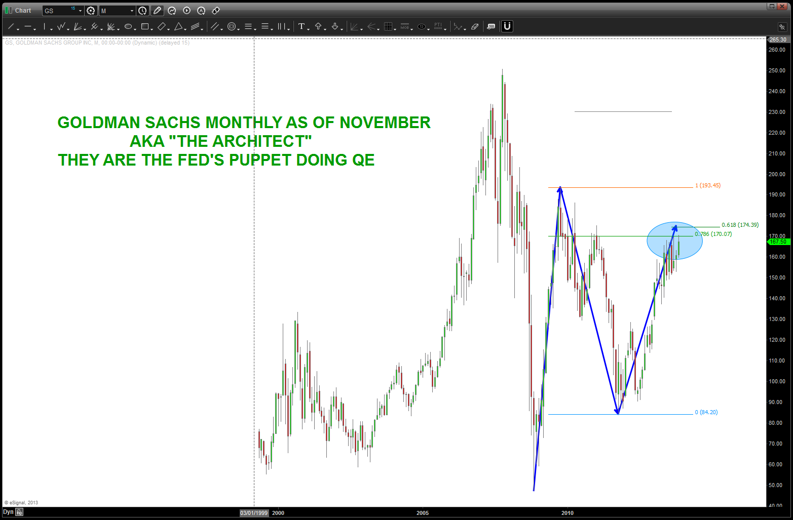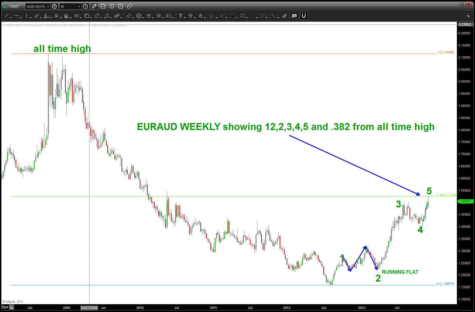 historical data is king … w/ the correct and long term data we can make some very powerful forecasts and look for patterns that others might not see. I came across a chart the other day that showed the price of Gold in/around 20 bucks when the FED was created in 1913. so, below I plotted the PRICE action that took us up the low of 252 in 2001. I wasn’t surprised that the recent low in Gold was a .382 from 20 bucks …NOW we can understand why this is an important level. In any liquid instrument that has been on an extended BULL or BEAR run the .382 correction is “usually” a good stopping point and a place to asses market action. strong and powerful trends will hit these levels and resume like a rocket ship. weak trends or shifts from bull to bear or vice versa will, usually, respect the area, but then will give away and continue lower.