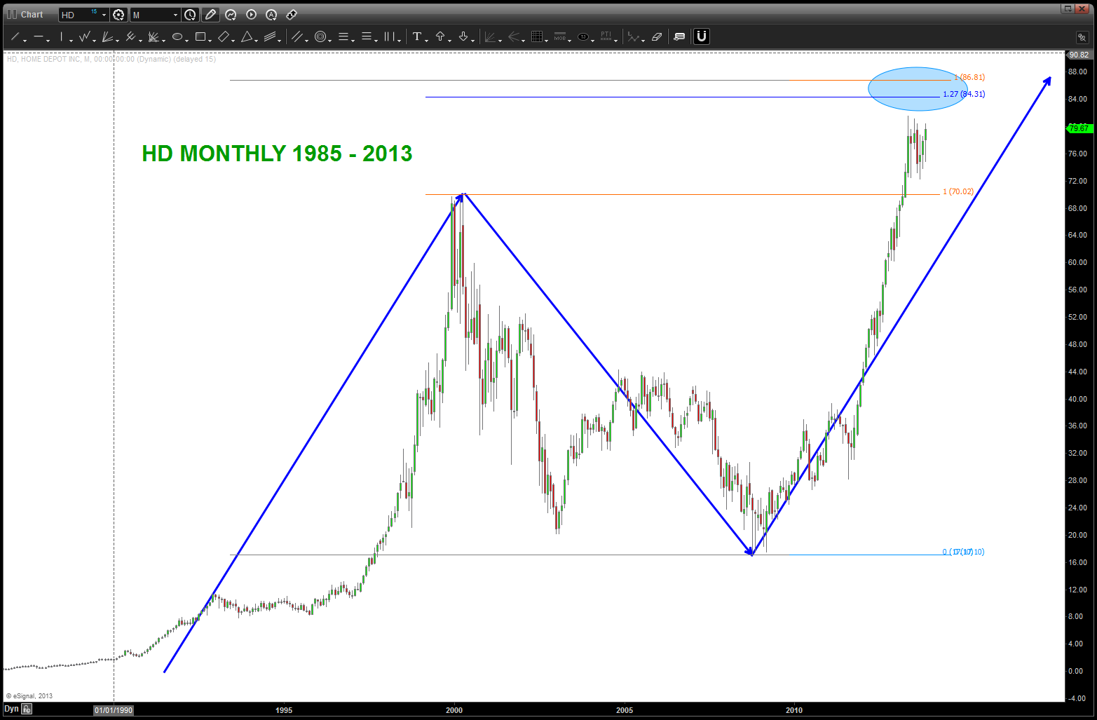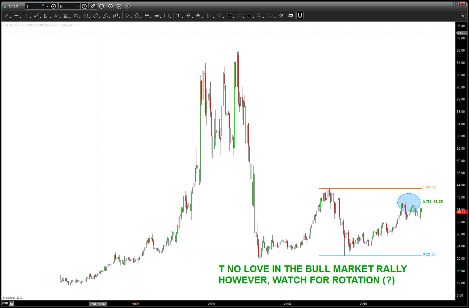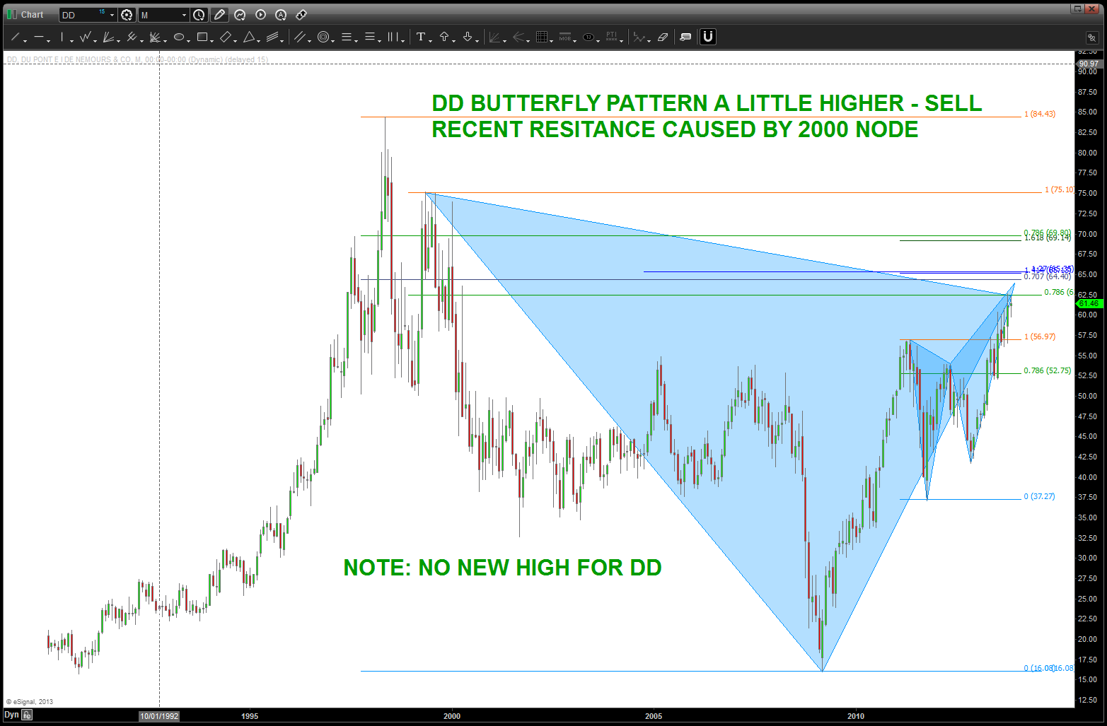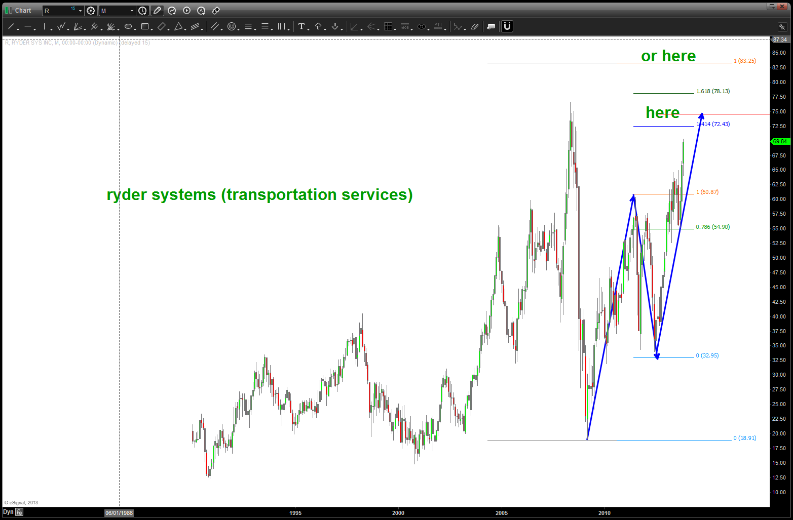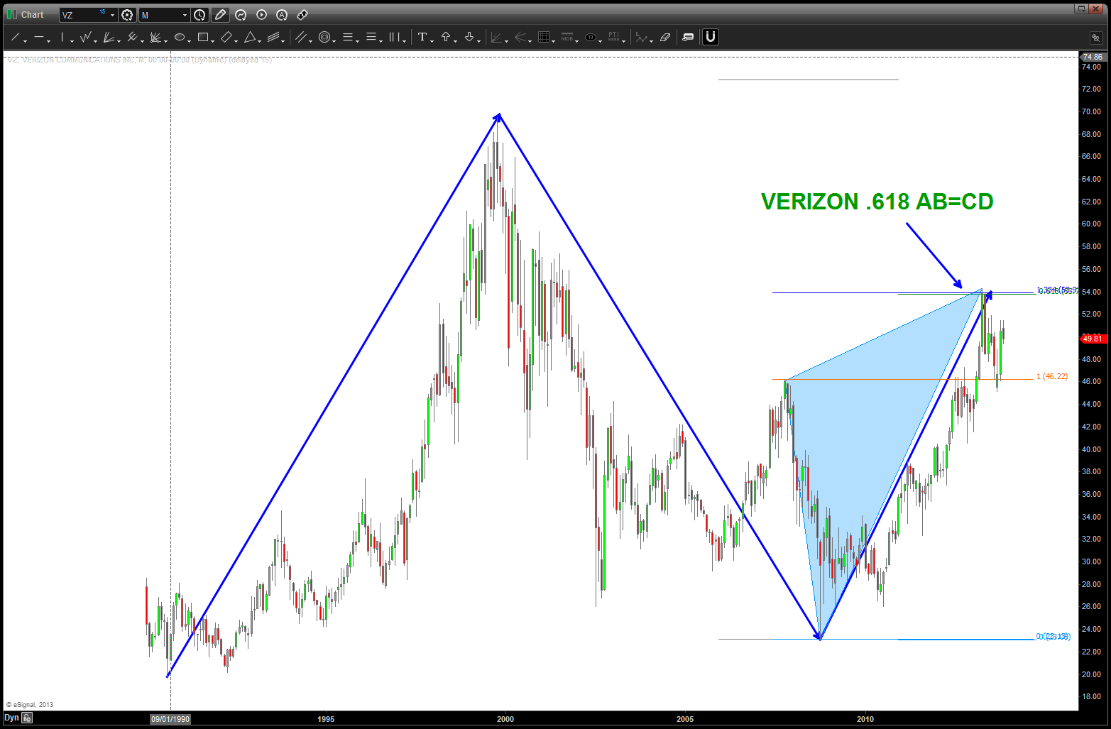 at the time, I was watching, extremely closely, the “standard” .618 price projection and it’s importance due to using the all time low from 1896 at 28.48. the market opened/closed in and around this level for roughly 5-6 months an then exploded higher.