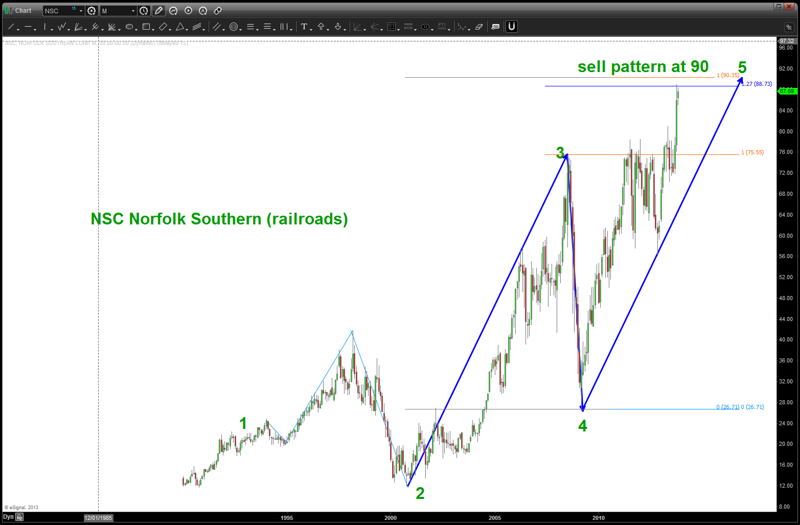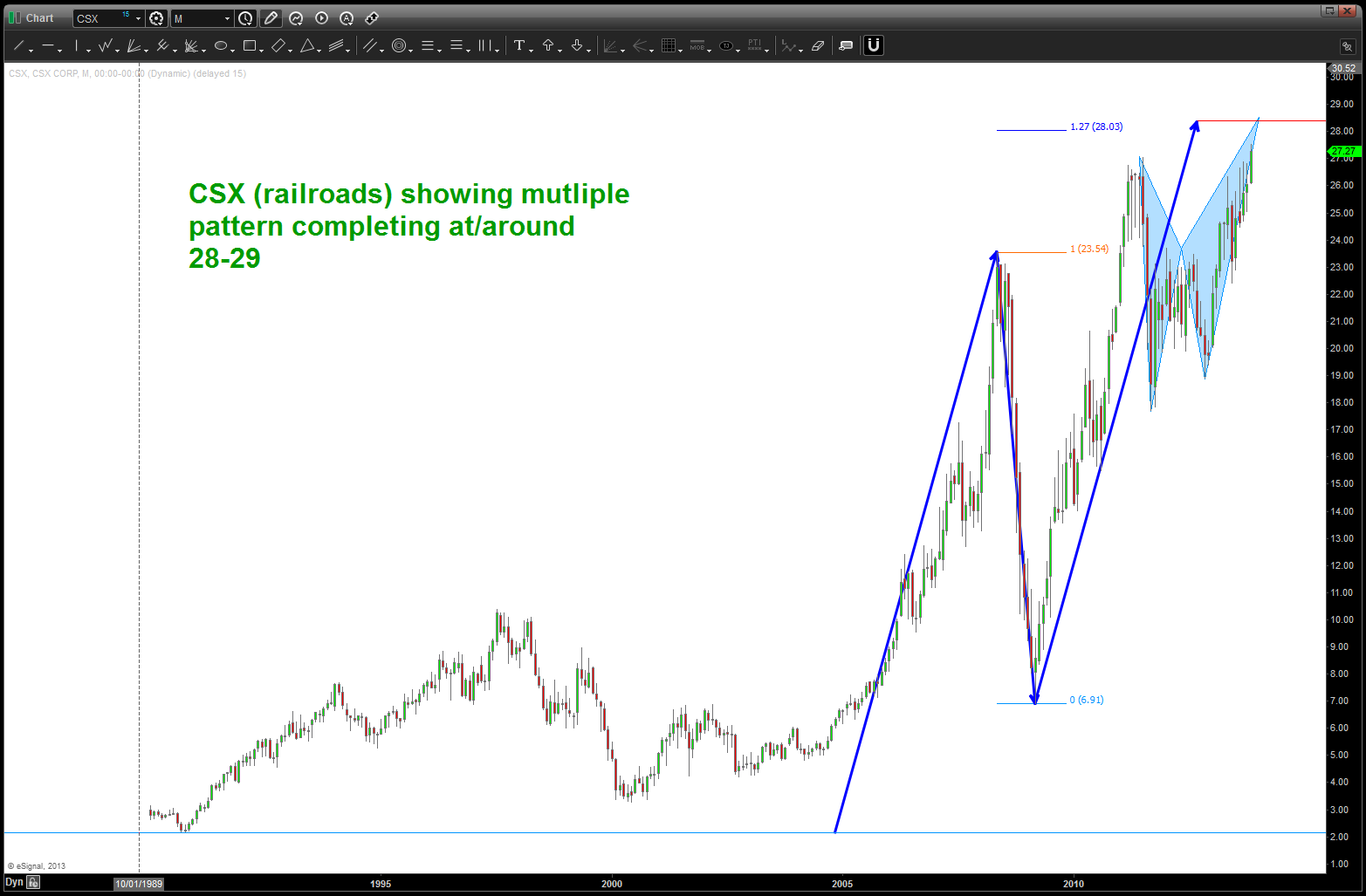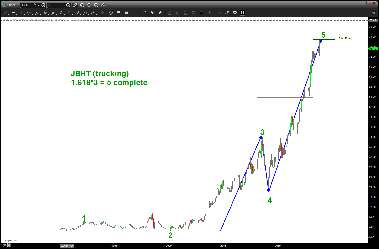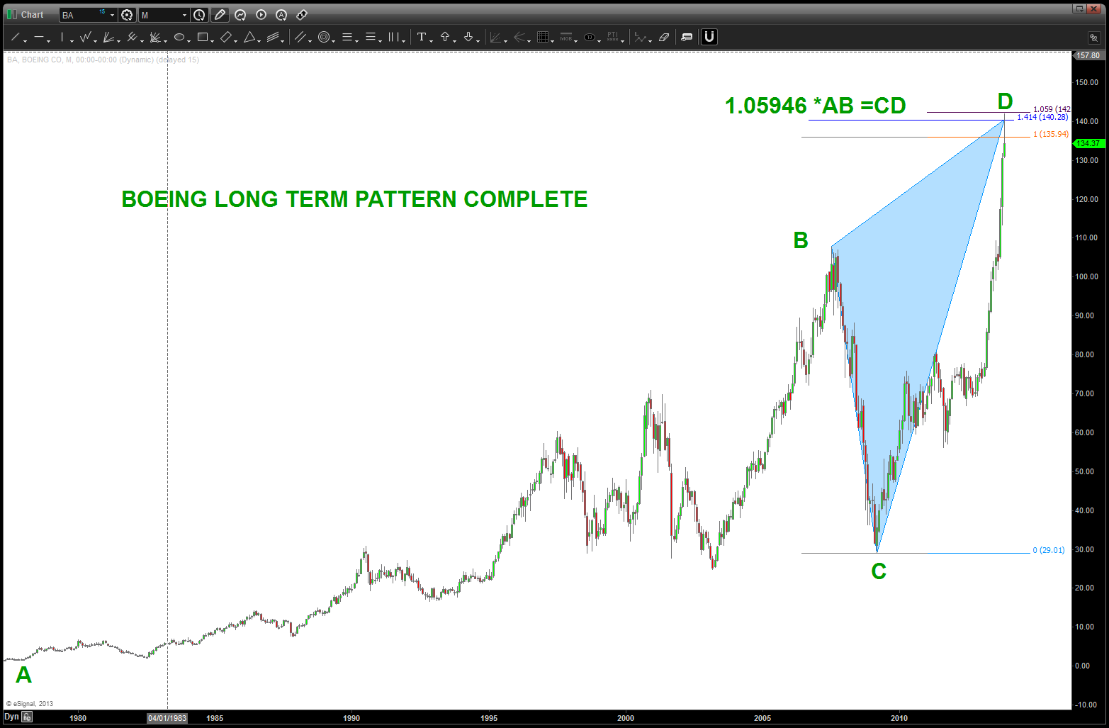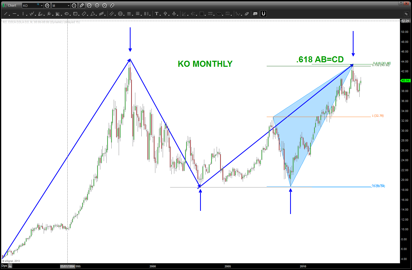 at the time, I was watching, extremely closely, the “standard” .618 price projection and it’s importance due to using the all time low from 1896 at 28.48. the market opened/closed in and around this level for roughly 5-6 months an then exploded higher.