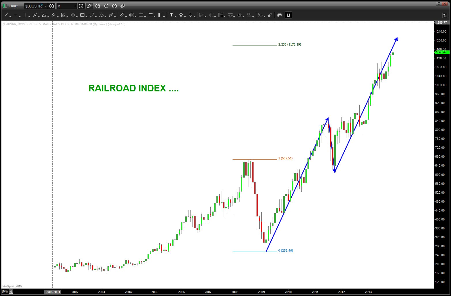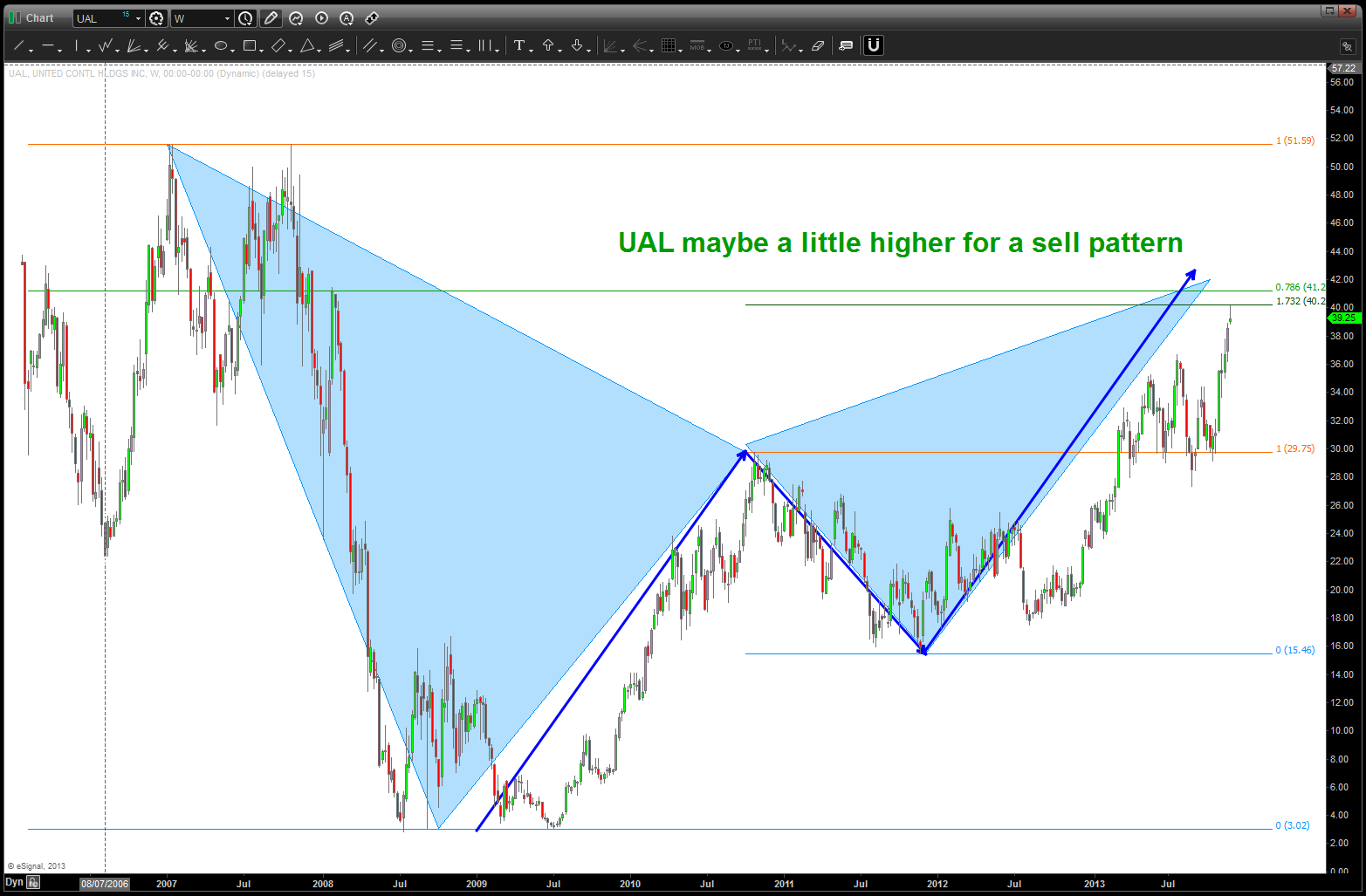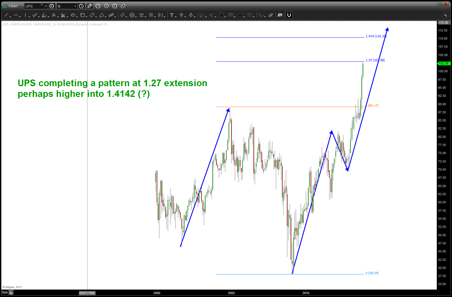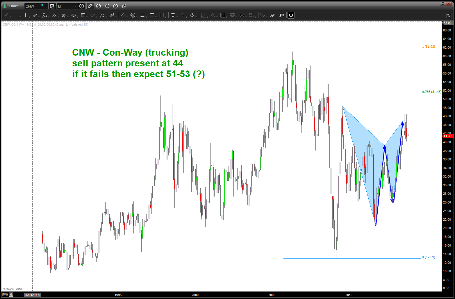 at the time, I was watching, extremely closely, the “standard” .618 price projection and it’s importance due to using the all time low from 1896 at 28.48. the market opened/closed in and around this level for roughly 5-6 months an then exploded higher.