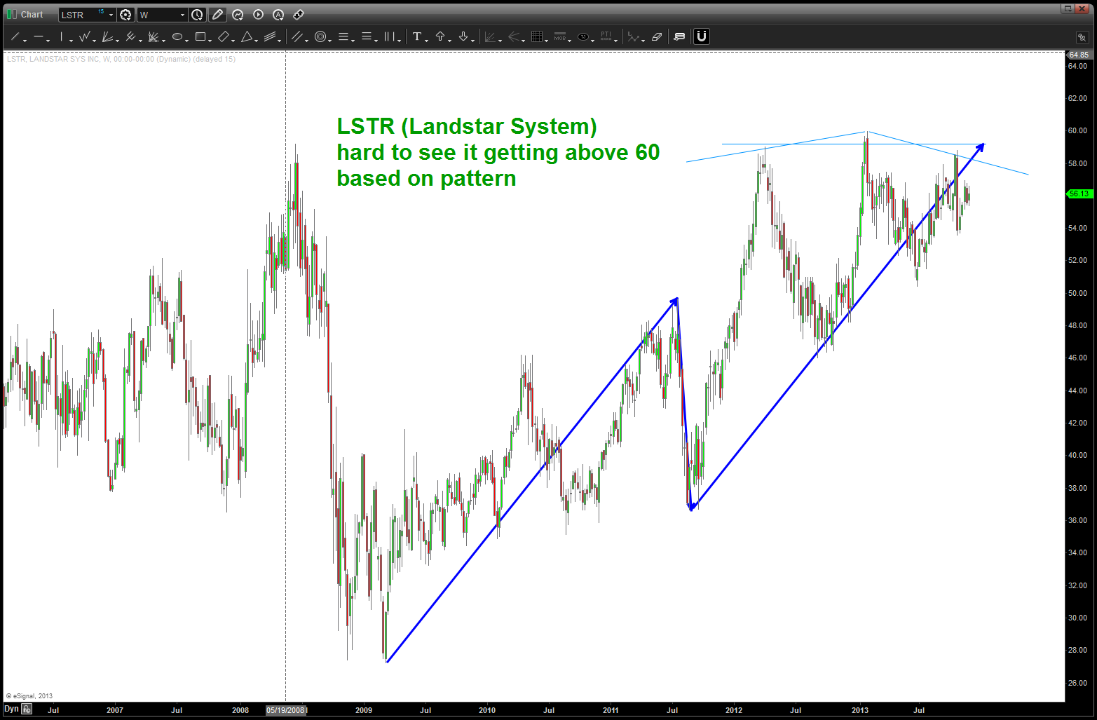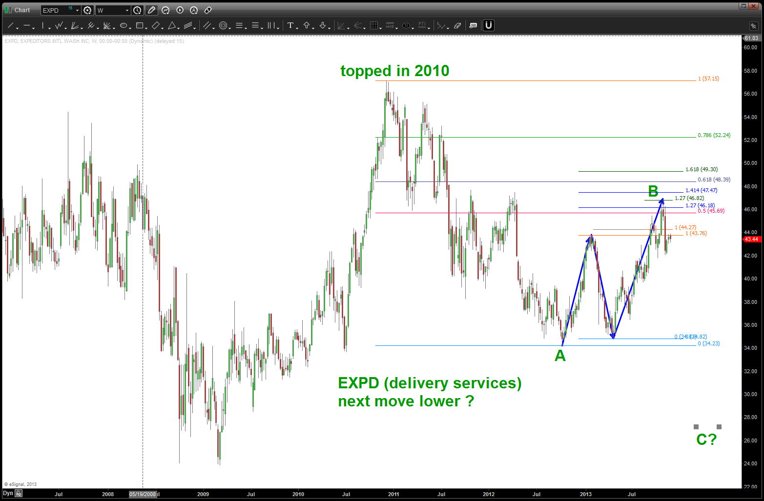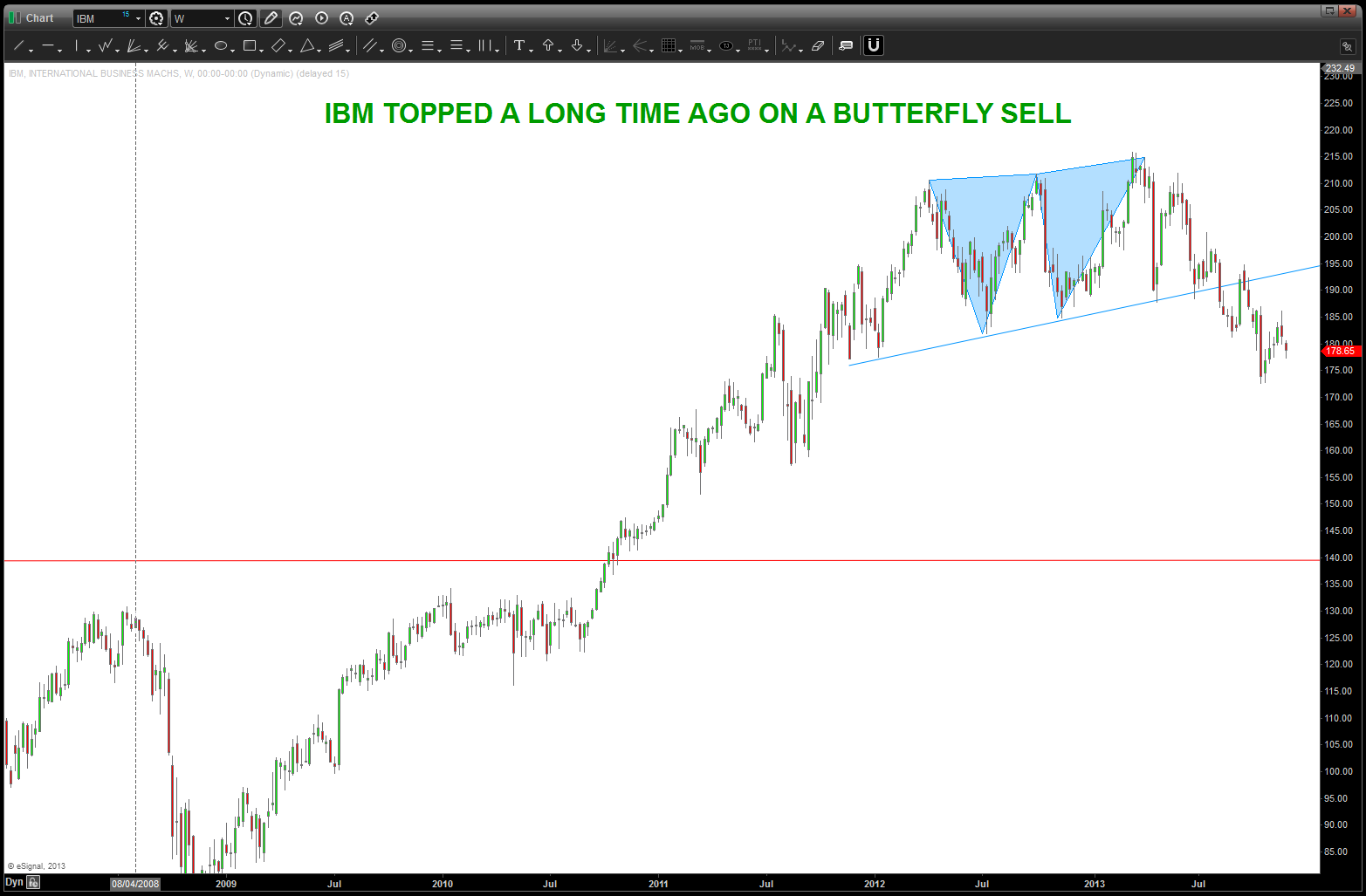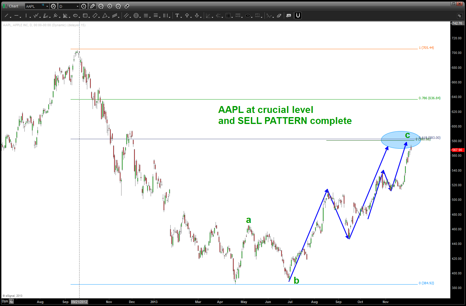 the “first” top that appeared gave us a sell signal and about 70 bucks but the market moved up and higher …now, we are completing another pattern along w/ returning to the trend line on AAPL. So, this is a very crucial juncture for the market …