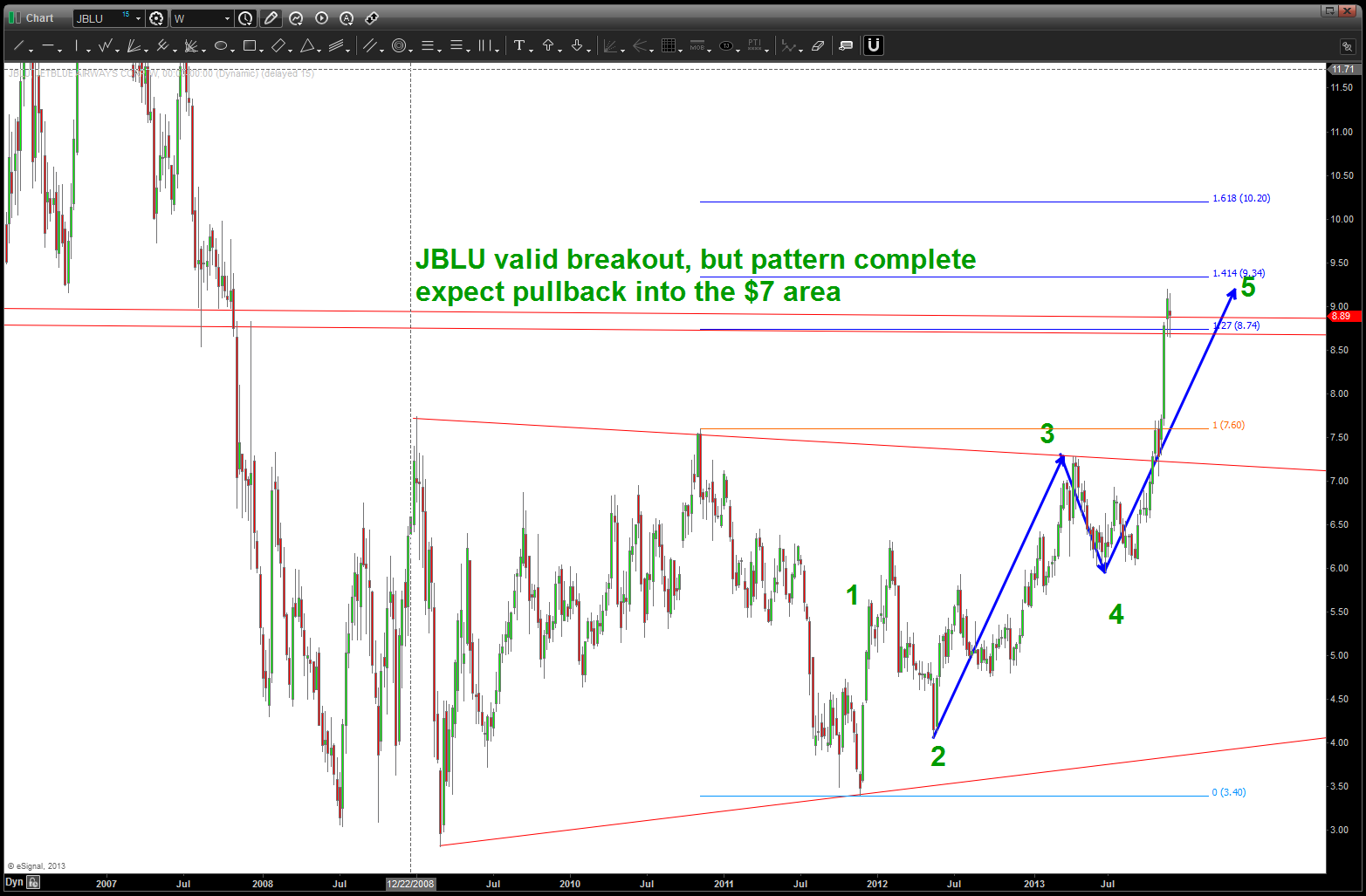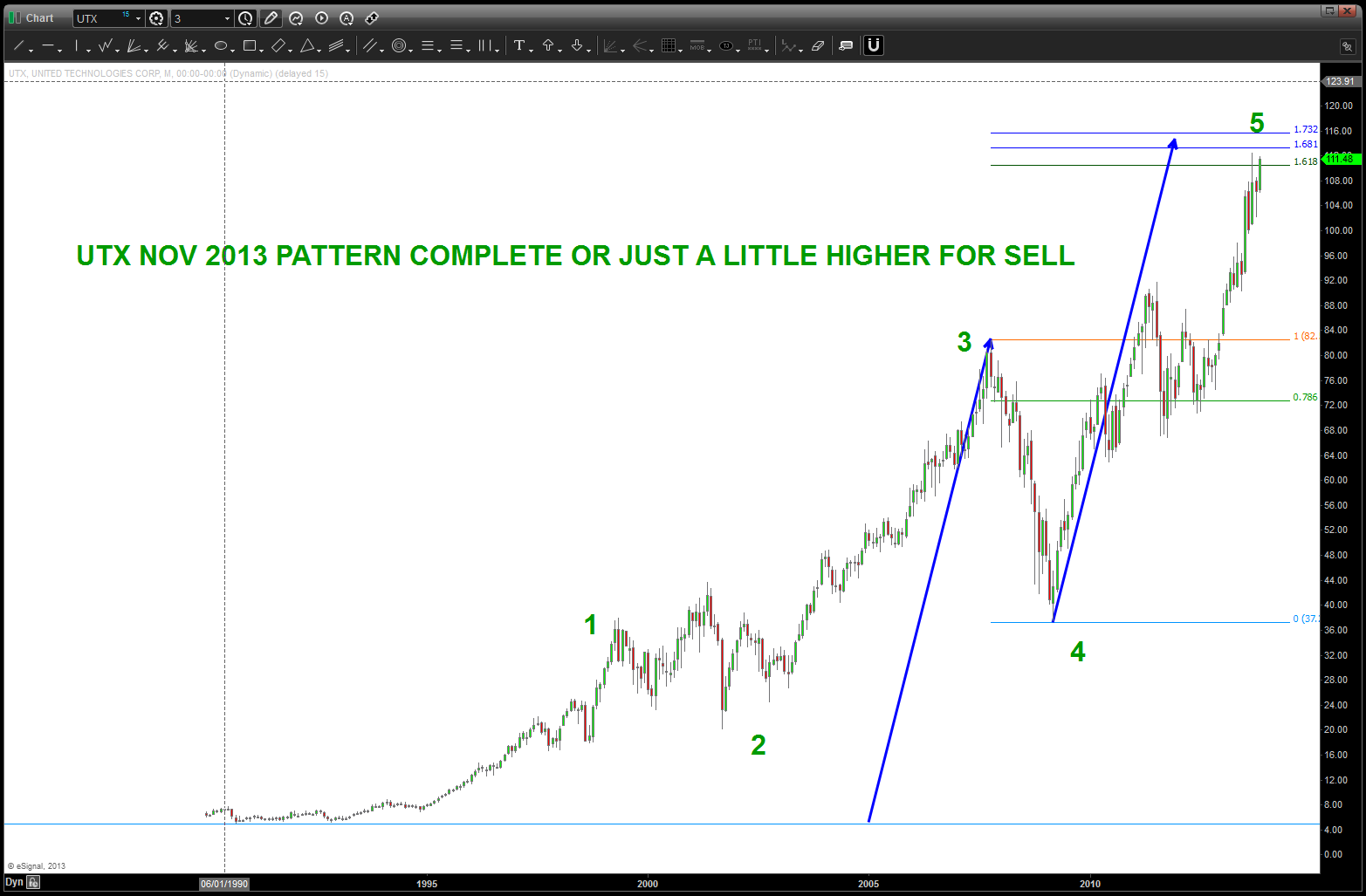 so, if we take musical note F# ratio of 1.68179 and then subtract 1 we get .68179. that is the multiple that we project from and that nails the recent high and also intersects the expanding triangle that is bearish. (1.618-1 = .618)