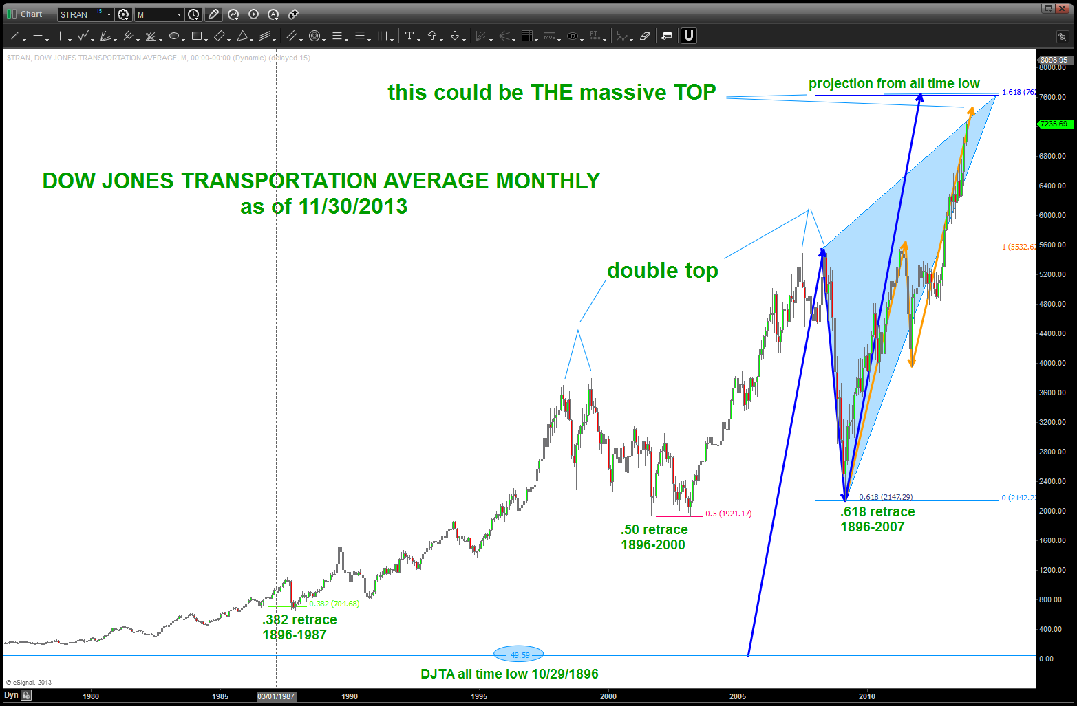 if you have been following the posts over the past couple months, you’ll find that I’ve moved (pretty much alone) into a very cautious, if not outright bearish mindset based on the patterns that are appearing across the circle of life. one of the more prevalent patterns that I’ve been watching is the DJTA. from the all time low of 49 on 10/29/1896 it has been shown how this key “node” was the anchor behind support in 1987, 2000 and 2009. Using this node we can now project for targets on the DJTA. anywhere between 7400-7600 on the index should be extremely important resistance if not an a major inflection point. here is the chart (updated as of 11/30/2013)