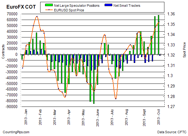 now, when we take a look at the the EURO we’ll see a pretty amazing picture w/ the net positions shown but this time w/ a price of the EURO vs USD overlaid on top of the positions. here take a look …