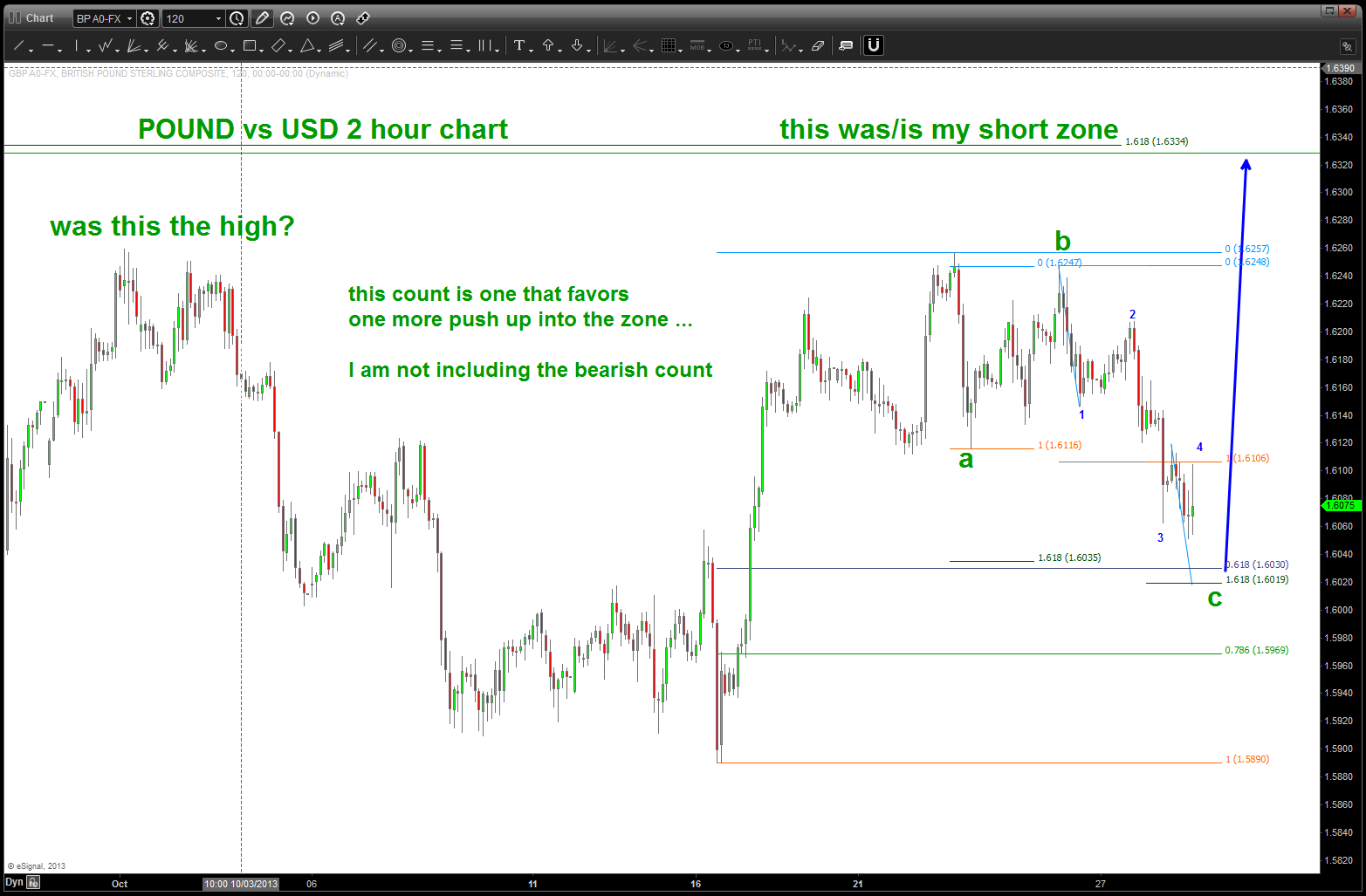 where are we now? well, if you have been following, my target zone of 1.6320 ish never got hit and it was missed by 60 pips which is just too many pips to swallow right now. so, below is the count I’m watching that could rise us to that area … I have not included the bearish count because it gets too darn confusing (imagine that in Elliott Wave) but the key here is that the “was this the high” could have done it and therefore we are in a wave 3 of something ( :)) so using stops if trying to get long is highly recommended. If we can successfully defend the 1.6020 area and get some THRUST and MOMENTUM going up then perhaps the target will be realized. If we LOSE 1.5969 then I think the top could be in place and I’m going to have to work like heck to get into a move .. sounds easy on this blog, but in the real world w/ massive moves and swings and a 24 hour market it’s simply hard to do …