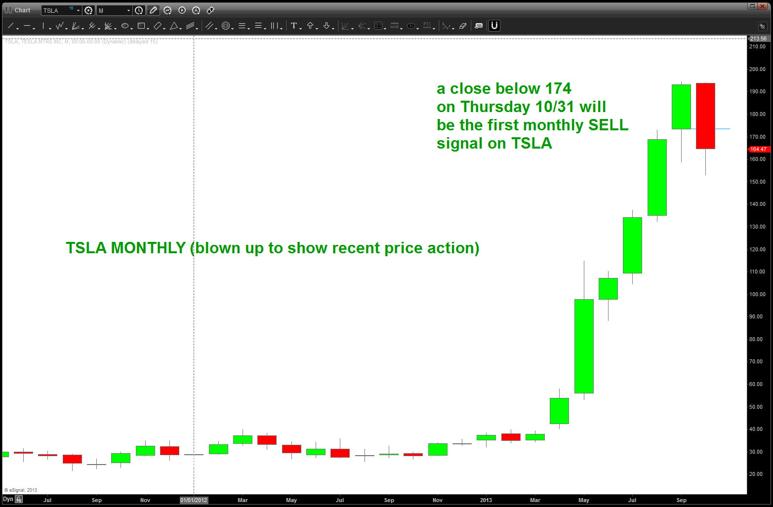 if you are a bull for TSLA, the 154-155 area was an ideal entry point because it represented the first BUY PATTERN to try and get into this amazing move. here’s the rub, this was a 20% correction (or so) in an very powerful and extended (straight up) parabolic advance, so I still believe caution is warranted. Particularly focus on a CLOSE below 174 after October 31. That will be the FIRST MONTHLY SELL signal since the stock IPO.