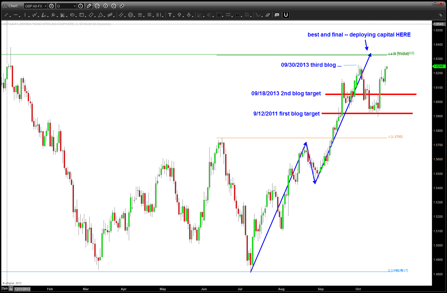 I have posted 3 prior “real time” blogs around trying to SHORT the Great British Pound vs the US Dollar and the wonderful pumpkin soup that I have eaten based on ANALYSIS … another true confession time, I have not deployed capital and have sustained ZERO losses since AUG 2013. Yes, I have not captured this pretty major move UP because I am dedicated to the short side so I am WAITING in CASH to deploy capital. Judge me or judge me not – the “look and feel” after spending 10,000 hours + on the charts – read the TIPPING POINT – has just let me allow the market to come to me and that is the beauty and the chain of a discretionary investor.