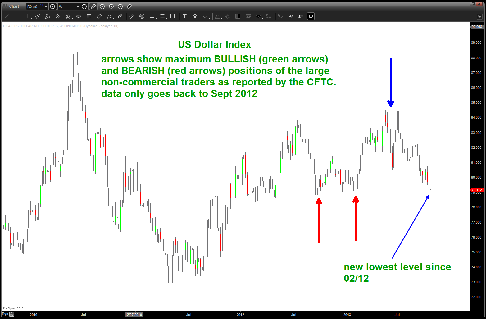 note the price of the EURO vs the USD .. at extreme levels of BEARISH and BULLISH points, the price did the opposite. When the level of bearishness by the large speculators was extreme the EURO went up and when the level was bullish it went down. take note of our dollar index we have been following since the end of August …w/ everything being presented here and in the past, certainly looks like being a dollar bull in/around here is the side of the market to be on …