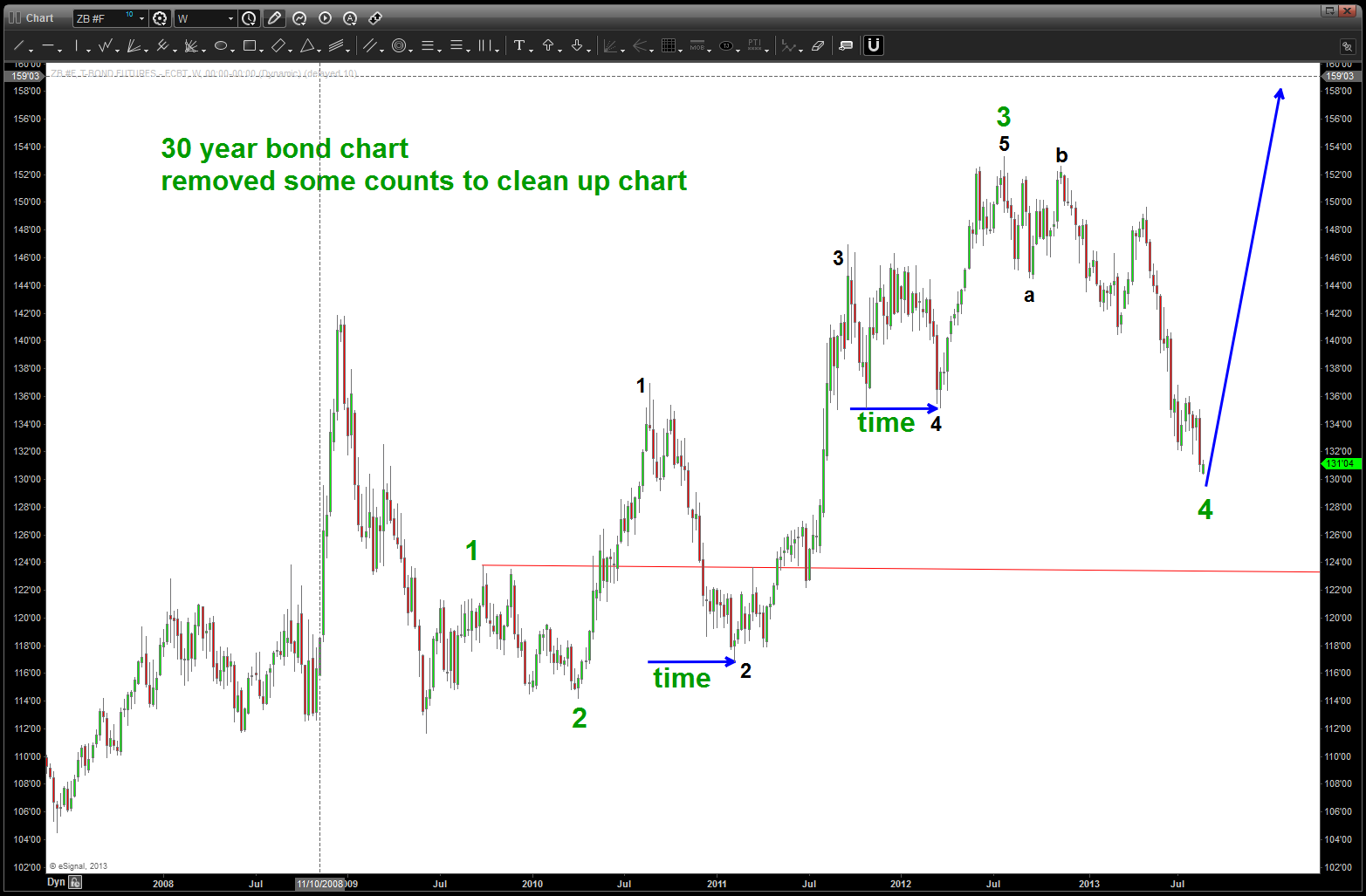 As you can see, we got “lucky” on our pattern at the top in/around the 153 level. One thing I was seeing and now I’m simply putting it out there is this count might not be complete. When we look at the long term chart we can see that we are at an extreme in price and time for corrections in this 30 year BULL MARKET and, going down to a weekly chart, we can see an orderly pullback in a “a”-“b”-“c” corrective move. Perhaps a little lower and then, believe it or not, a potential rally to slight new highs ….? Call me crazy but calling it like I see it. At a minimum, this move is very oversold so a bounce in/around here is a real potential. Stay tuned …..