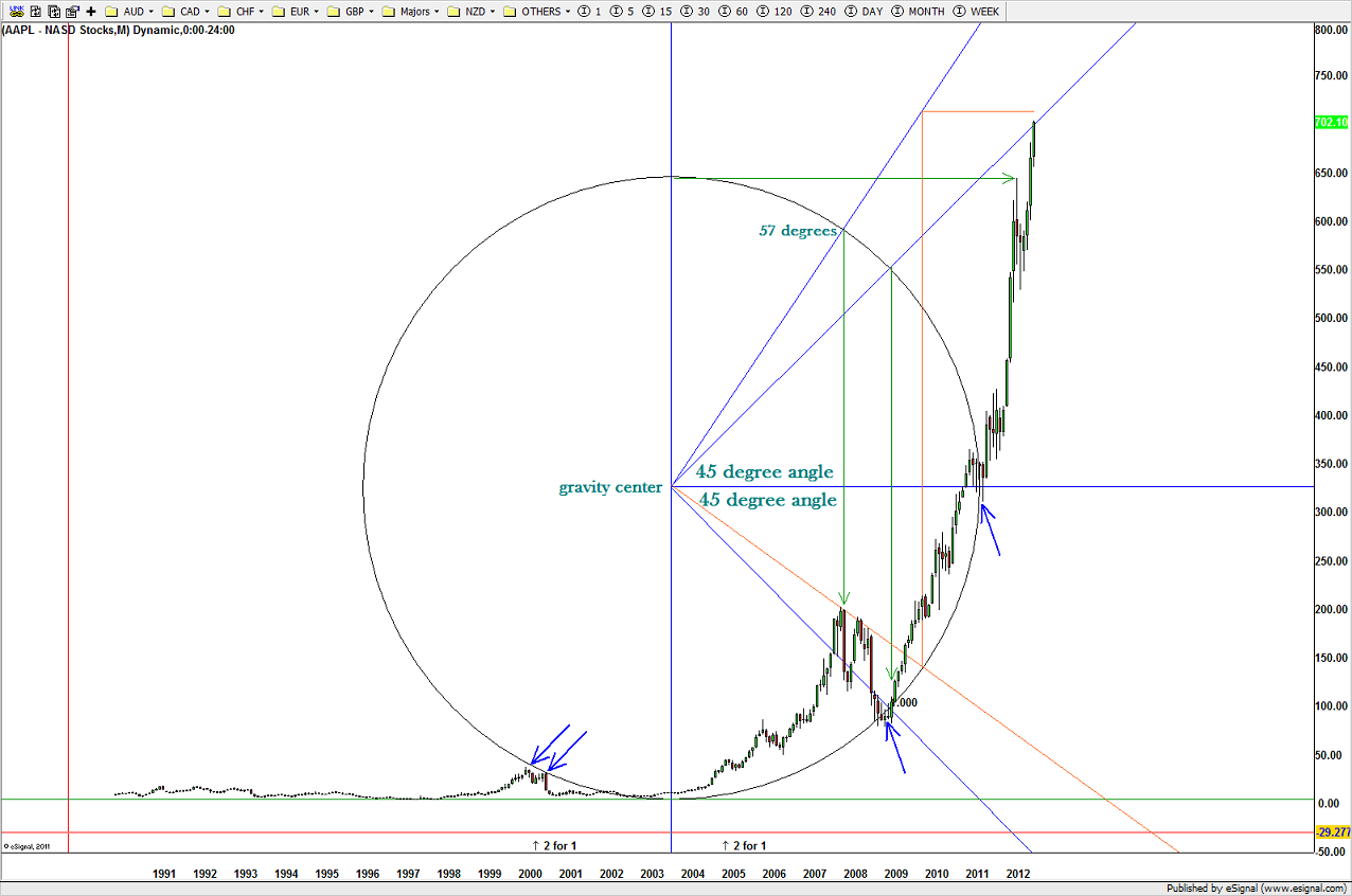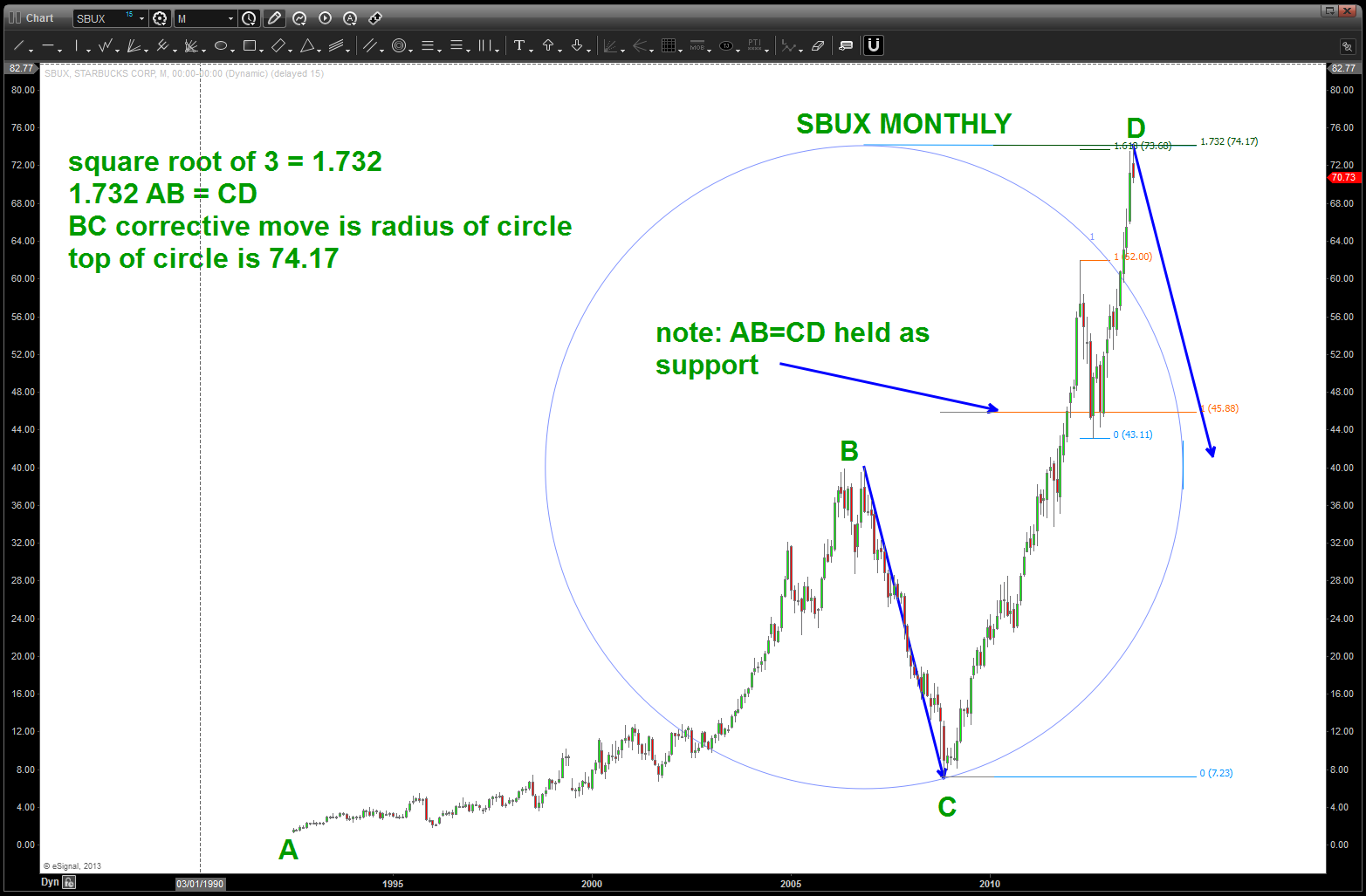 A very good and long time friend of mine has the unique opportunity to work in the intelligence community. From time to time, we meet at $SBUX and just sit and watch the people move in/out of the store w/ their 5$ coffee’s. He always remarks how $SBUX “is not the real world” and that his office is the real world. True or not, I do consider this company a contrarian indicator. The market, in my world, is the sum of the vibrational energy of the masses. And, if the masses are still willing to pay outrageous prices for their fix then, the market is simply not ready to go down. This chart has me extremely interested …lot’s of geometry equals lots of resistance. Take a peak ….