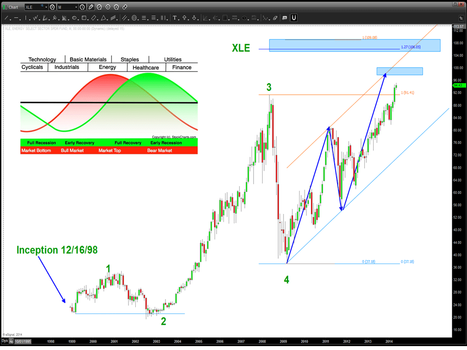 just showing by the chart below 1) a 5 wave count since it’s inception and some targets and 2) the sector rotation guide that shows energy peaking last before the cycles turn down. we have shown many many PATTERNS that are calling for a sell. Some have worked, some haven’t but as you can see the targets depicted on the XLE are just a little higher and then, again, we take pause and adjust accordingly.